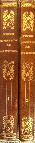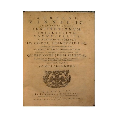 Accedunt in hac novissima editione juxta exemplar Lugduniense adornatan ejusdem Vinnii quaestiones juris selectae, praemittitur ex editione Veneta Jacobi Gothofredi Historia & Bibliotheca Juris Civilis Romani. Adjectis indicibus locupletissimis - in 8° - pp.XXVIII, 459; IV, 387 - Mezza pelle con titolo e fregi in oro al dorso - 4 libri in due volumi - Un'aquila bicipite con una corona tra le due teste. In una cornice ovale sui front. Testatine, capilettera e finalini xilografici - Testo in latino su due colonne - Diffuse lievi fioriture