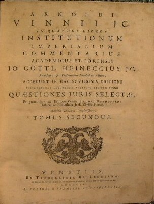 Arnoldi Vinnii JC. In quatuor libros institutionum imperialium commentarius academicus et forensis Jo. Gottl. Heineccius JC. recensuit, & praefationem notulasque adjecit