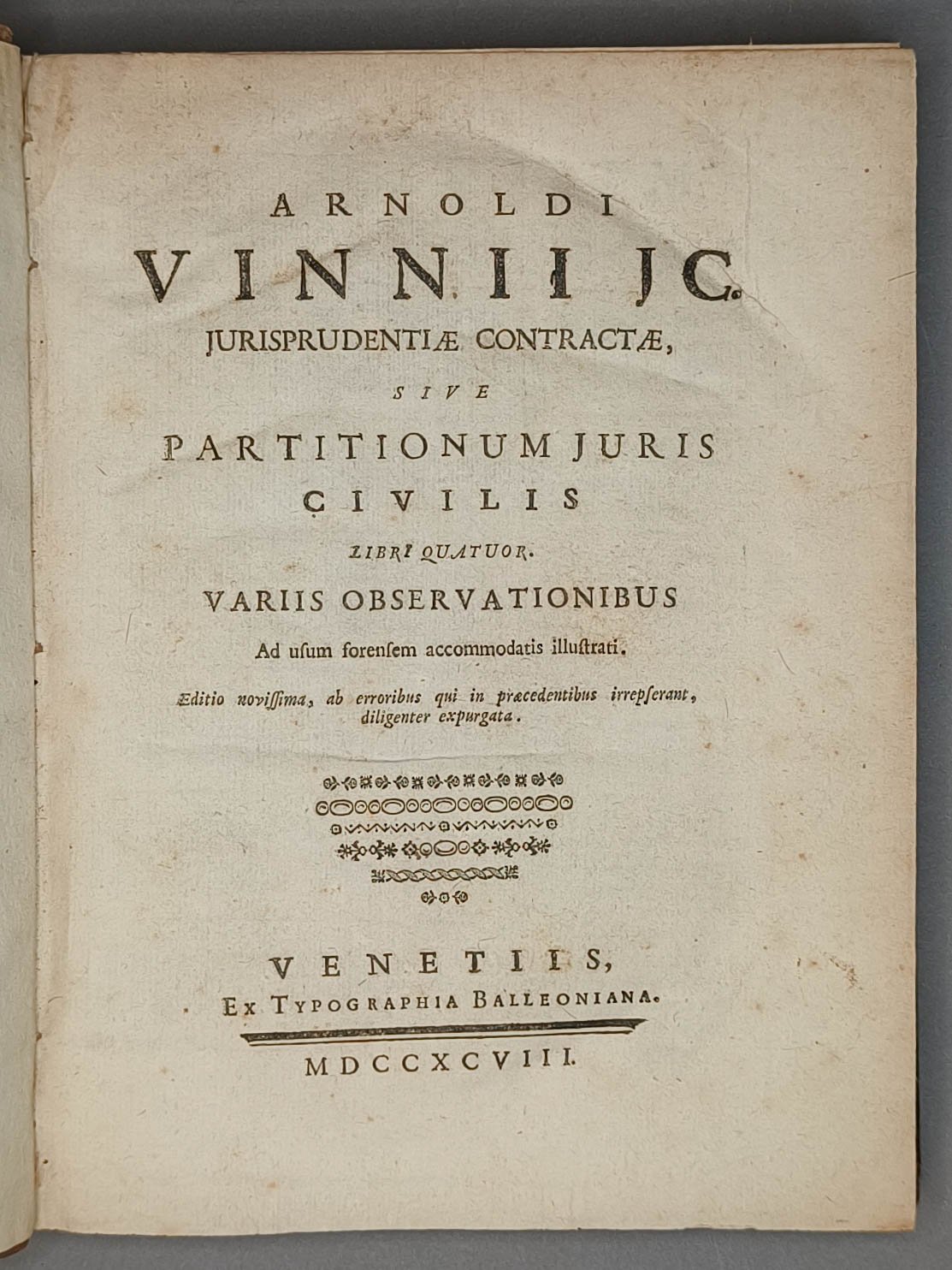Arnold Vinnen, Arnoldi Vinnii Jc. Jurisprudentiae contractae sive partitionum juris civilis libri quatuor variis observationibus ad usum forensem accommodatis illustrati. Editio novissima ab erroribus qui in praecedentibus irrepserant diligenter expurgata, Venezia, Ex Typographia Balleoniana, 1798.
