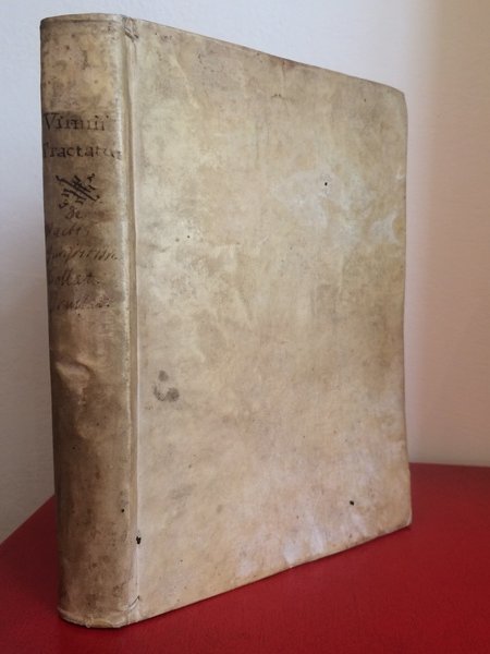 Legatura coeva in piena pergamena rigida con nervi passanti alle cuffie e titoli manoscritti sul dorso, tagli spruzzati blu, 4to cm18x23.5, pp (8) 288 (16), frontespizio in nero e rosso. Oltre ai quattro trattati del giurista olandese Arnold Vinnen (1588-1657) il volume contiene due orazioni del figlio Simon: DE CONSTANTIA JURIS NATURAE (1648) e DE SAPIENTIA ROMANORUM (1651).