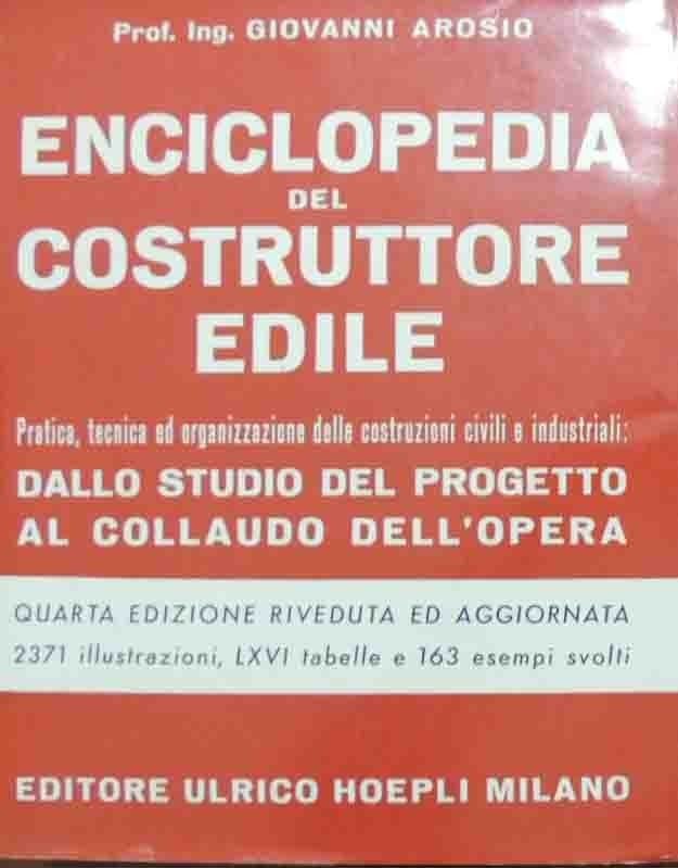 Giovanni Arosio, Enciclopedia del costruttore edile. Pratica, tecnica ed organizzazione delle costruzioni civili e industriali. Dallo studio del progetto al collaudo dell'opera. 2371 illustrazioni. LVVI tabelle e 163 esempi svolti, Editore Ulrico Hoepli, Milano 1965, quarta ed. riveduta ed aggiornata, pp. XXIII, 1018, ill. b.n., cm 28, cart. ed. con titoli al piatto e al dorso e sovr. Poderoso manuale Hoepli, ricchissimo di illustrazioni. Lievi tracce d'uso alla sovraccoperta, minimi accenni di fioriture, un piccolo rinforzo alla cerniera interna del piatto anteriore, per il resto esemplare ben conservato.