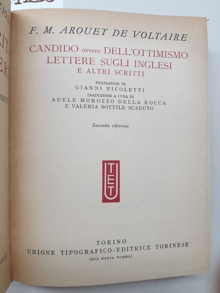Arouet de Voltaire Candido ovvero dell'ottimismo lettere sugli inglesi ed altri scritti UTET 1962