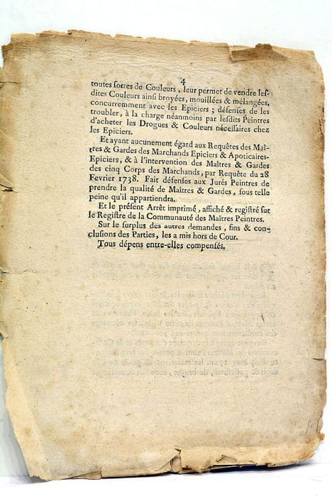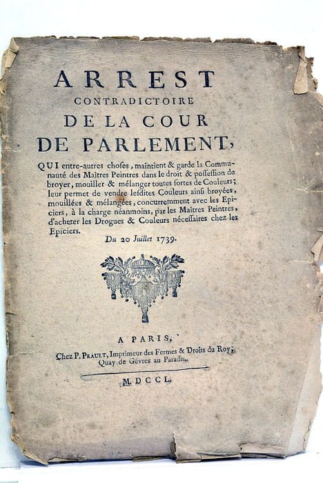 Arrest contradictoire de la Cour de Parlement, qui entre-autres choses, maintient et garde la Communauté des maîtres Peintres dans le droit et possession de broyer, mouiller et mélanger toutes sortes de Couleurs; leurs permet de vendre lesdites Couleurs ainsi broyées, mouillées et mélanges, concurremment avec les Epiciers, à la charge néanmoins, par les Maîtres Peintres, d'acheter les Drogues et Couleurs Nécessaires chez les Epiciers.