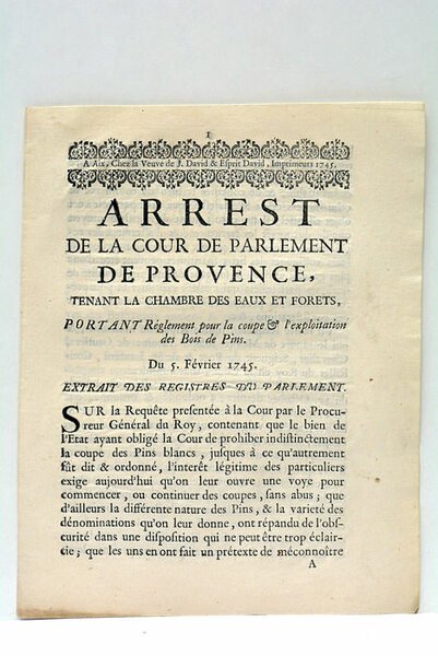 ARREST DE LA COUR DE PARLEMENT DE PROVENCE, Tenant la Chambre des Eaux et Forêts, Portant Réglement pour la Coupe et l'Exploitation des Bois de Pins. Du 5. Février 1745.