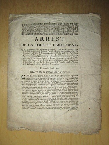 Arrest de la Cour de Parlement [ du 1er avril 1746 ], Qui. prohibe à ceux de la Religion Prétendue Reformée l'exercice de toutes sortes de Charges de Judicatures, & d'Offices de Procureurs, Notaires, Greffiers, Sergens & Huissiers, & autres Fonctions Publiques dans quelques Jurisdictions que ce puisse être ; même aux Médecins, Chirurgiens & Apotiquaires d'exercer ces Arts & Professions, s'ils ne sont attestés être de la Religion Catholique, Apostolique & Romaine : Fait défenses à tous Prêtres, Curés & Vicaires de donner des Certificats de Catholicité qu'à ceux dont dont ils seront certiorés de l'exercice actuel qu'ils font de la Religion Catholique, Apostolique & Romaine.
