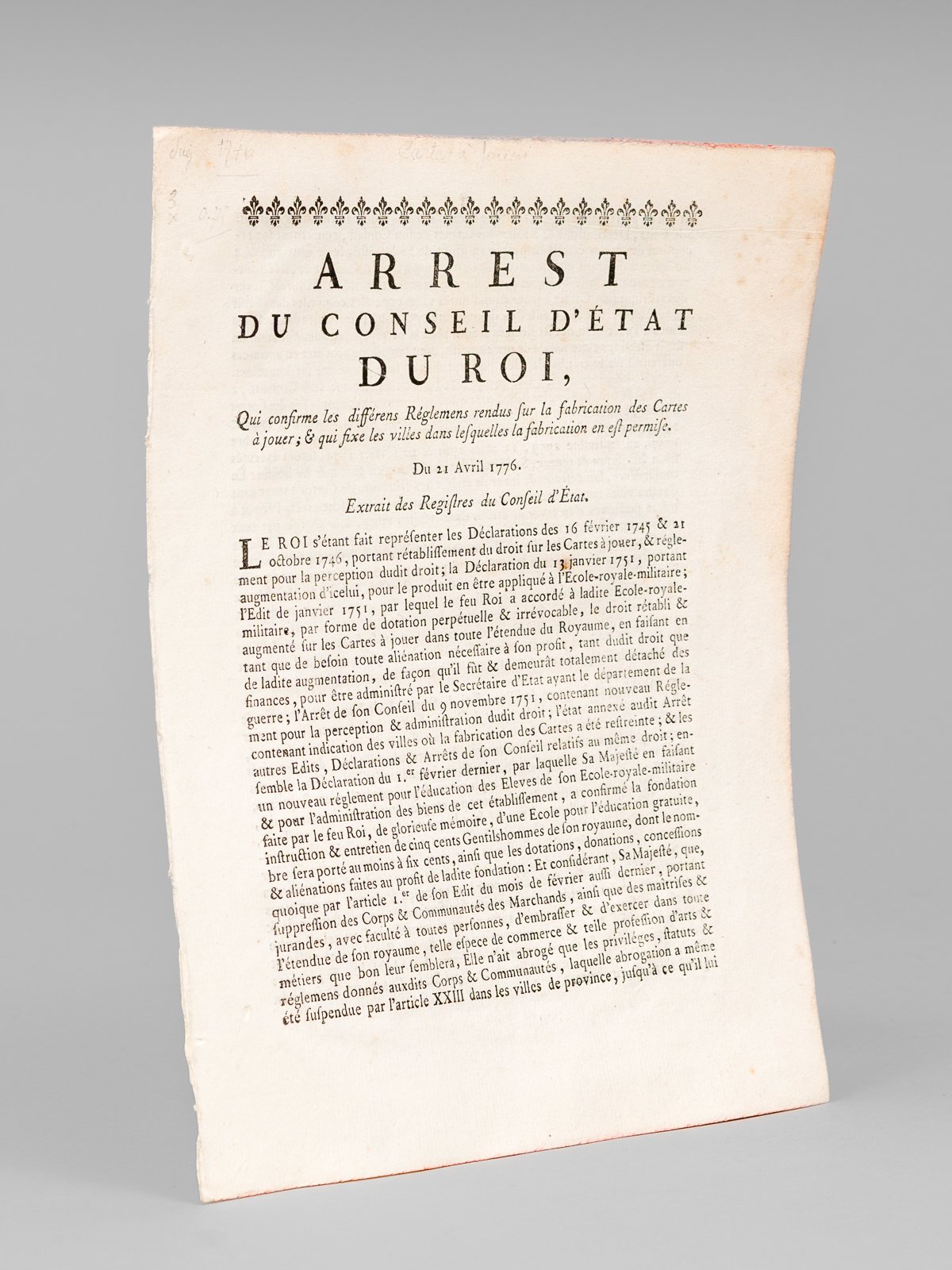 Extrait des registres du Conseil d'Etat, 1 brochure in-8, Chez P. G. Simon, [ Paris ], 1776, 4 pp. Rappel du titre complet : Arrest du Conseil d'Etat du Roi, Qui confirme les différens Règlemens rendus sur la fabrication des Cartes à jouer, & qui fixe les villes dans lesquelles la fabrication en est permise, du 21 Avril 1776 Bon état pour ce remarquable document, détaillant l'état des "Villes où sa Majesté veut & entend que la fabrication des Cartes soit restreinte, en exécution de son Conseil de cejourd'hui". La taxe spécifique sur les cartes à jouer ne sera supprimée qu'en 1959.