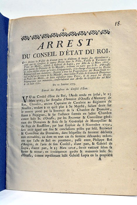 ARREST du conseil d'état du Roi, qui déclare la Vallée de Connat avec le Château et toutes ses Dépendances, ainsi que les Censives et autres Droits dans la ville, Vallée et Territoire de Prats-de-Mollo, aliénés à Gabriel de Lupia, par Acte du 13 mars 1606, faire partie du Domaine de Sa Majesté.