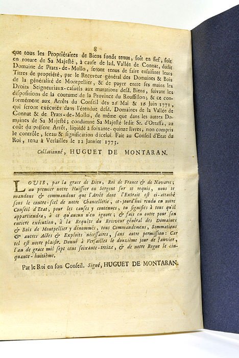 8 pages. (23x18 Cm). Broché, couverture postèrieure. Déclaration officielle portant sur la saisie des propriétés de Gabriel de Lupia sur le territoire de Prats-de-Mollo, concédées au sieur d'Ortaffa. Rares rousseurs. Bon état.