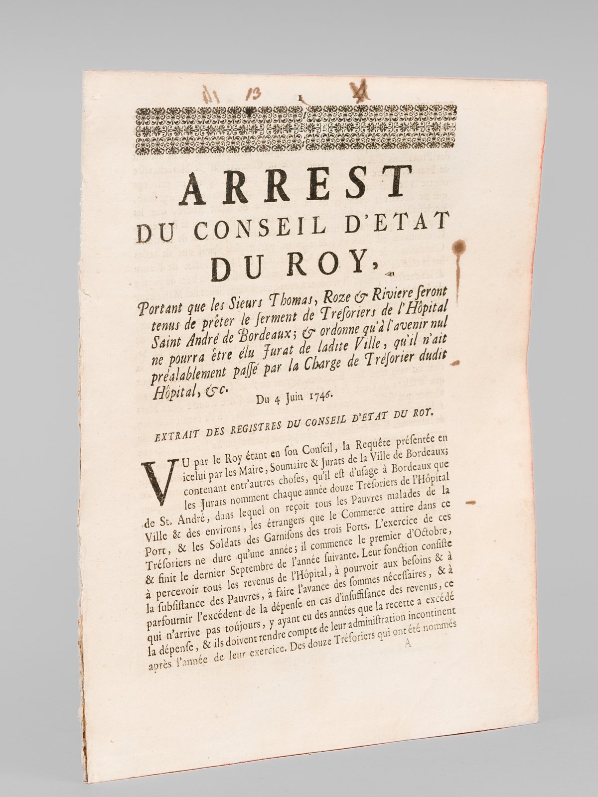 Arrest du Conseil d'Etat du Roy, Portant que les Sieurs Thomas, Roze & Rivière seront tenus de prêter le serment de Trésoriers de l'Hôpital Saint André de Bordeaux ; & ordonne qu'à l'avenir nul ne pourra être élu Jurat de ladite Ville, qu'il n'ait préalablement passé par la Charge de Trésorier dudit Hôpital, &c Du 4 juin 1746 [ On joint : ] Extrait des Registres de Parlement [du 15 mars 1590 sur la boucherie de l'Hôpital Saint André, pour la viande destinée aux pauvres malades pendant le Carême ]