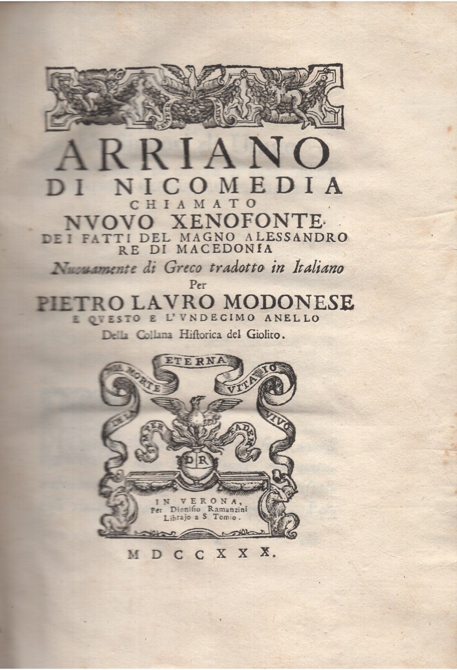 Dei fatti del magno Alessandro re di Macedonia nuovamente di greco tradotto in italiano. Piatto antriore parzialmente staccato dal dorso, ma legatura mantenuta. Ex libris araldico al contropiatto anteriore