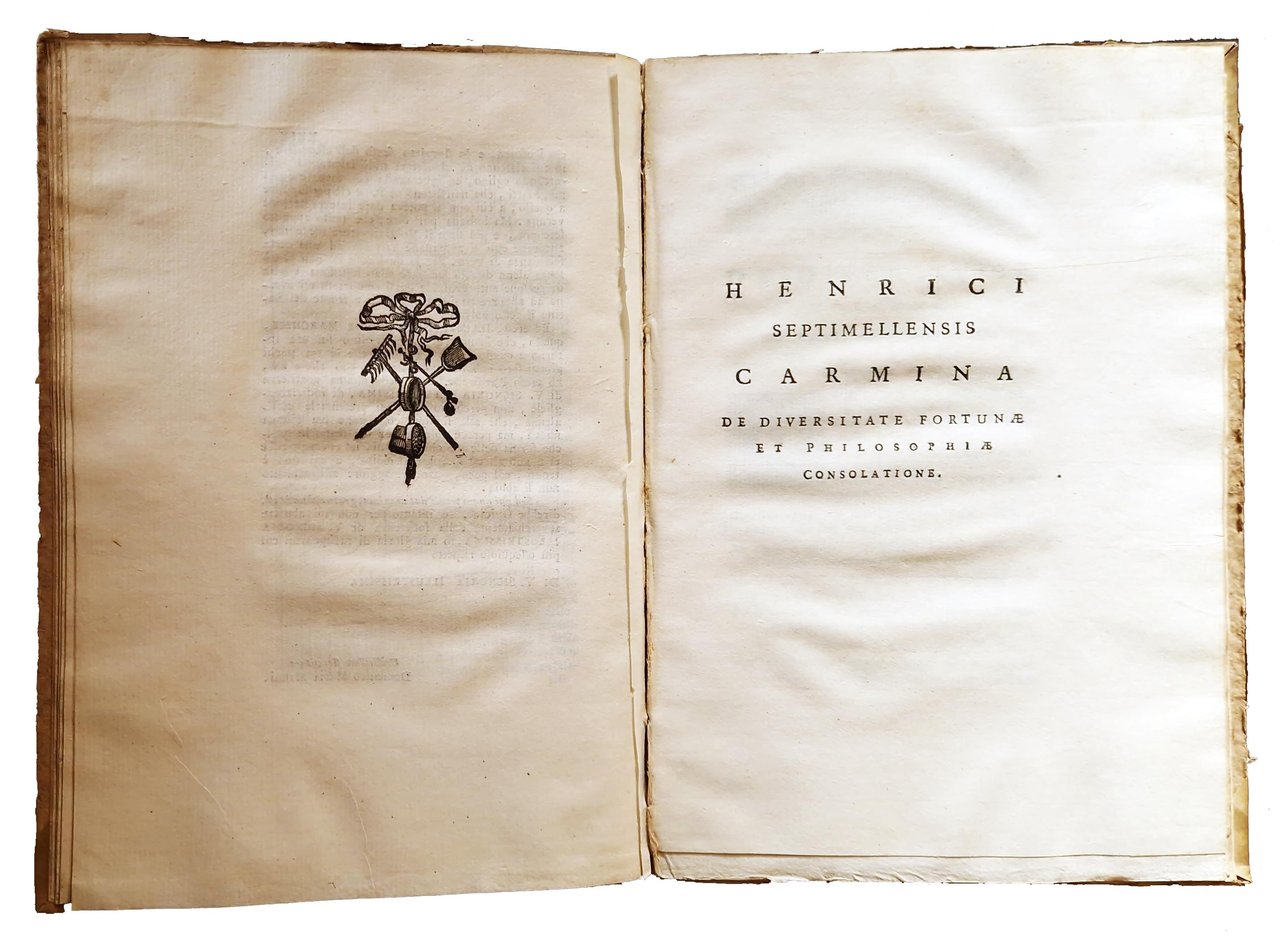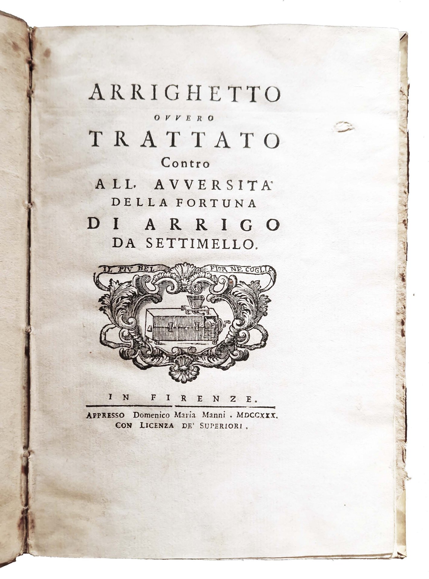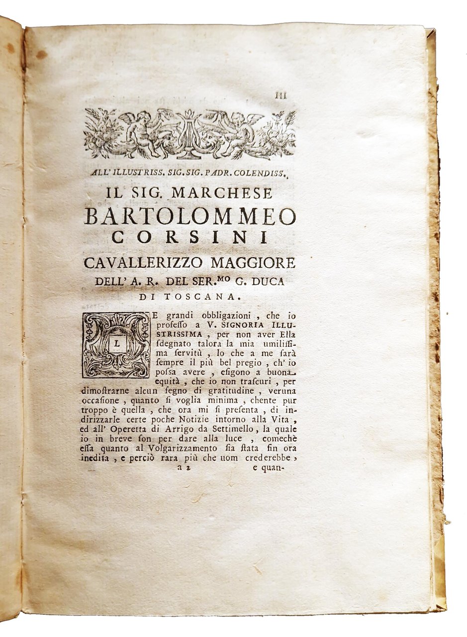 in-8°, 220x150 mm, leg. coeva in mezza peramena con angoli e carta marmorizzata ai piatti; pp. XXIX, [3], 3-77, [3]. Testatine, iniziali e fregi xilografici; vignetta xilografica al frontespizio, raffigurante l'insegna della Crusca (Buratto. Motto: Il piu bel fior ne coglie). Testo in Latino (la prima parte con i Carmina) e in Italiano (la parte del Trattato). A c. A1r occhietto con tit.: Henrici Septimellensis Carmina De diversitate fortunæ et philosophiæ consolatione. A c. F1r occhietto con tit.: Trattato contro all'avversità della fortuna di Arrigo da Settimello. Prima edizione a cura del Manni di questo trattato di Arrigo, ovvero Arrighetto da Settimello, poeta italiano del XII secolo. Quest'opera tratta della volubilità della sorte messa in contrapposizione al fermo e sicuro sollievo che viene dalla filosofia. È composta da mille versi e fu molto popolare nel Medioevo. Il tema è l'instabilità e l'imprevidibilità della Fortuna e della capacità della "filosofia" di "dare all'uomo la coscienza della sua autonomia morale" (Angelo Monteverdi). Rif.: IT\ICCU\RAVE\009560. OCLC, 559582543. Cond.: Lievi tracce d'uso alla legatura (piccole abrasioni alle carte dei piatti). Carte parzialmente in barbe. Piccolo foro a margine del frontespizio. Occasionali bruniture. Esemplare molto buono.