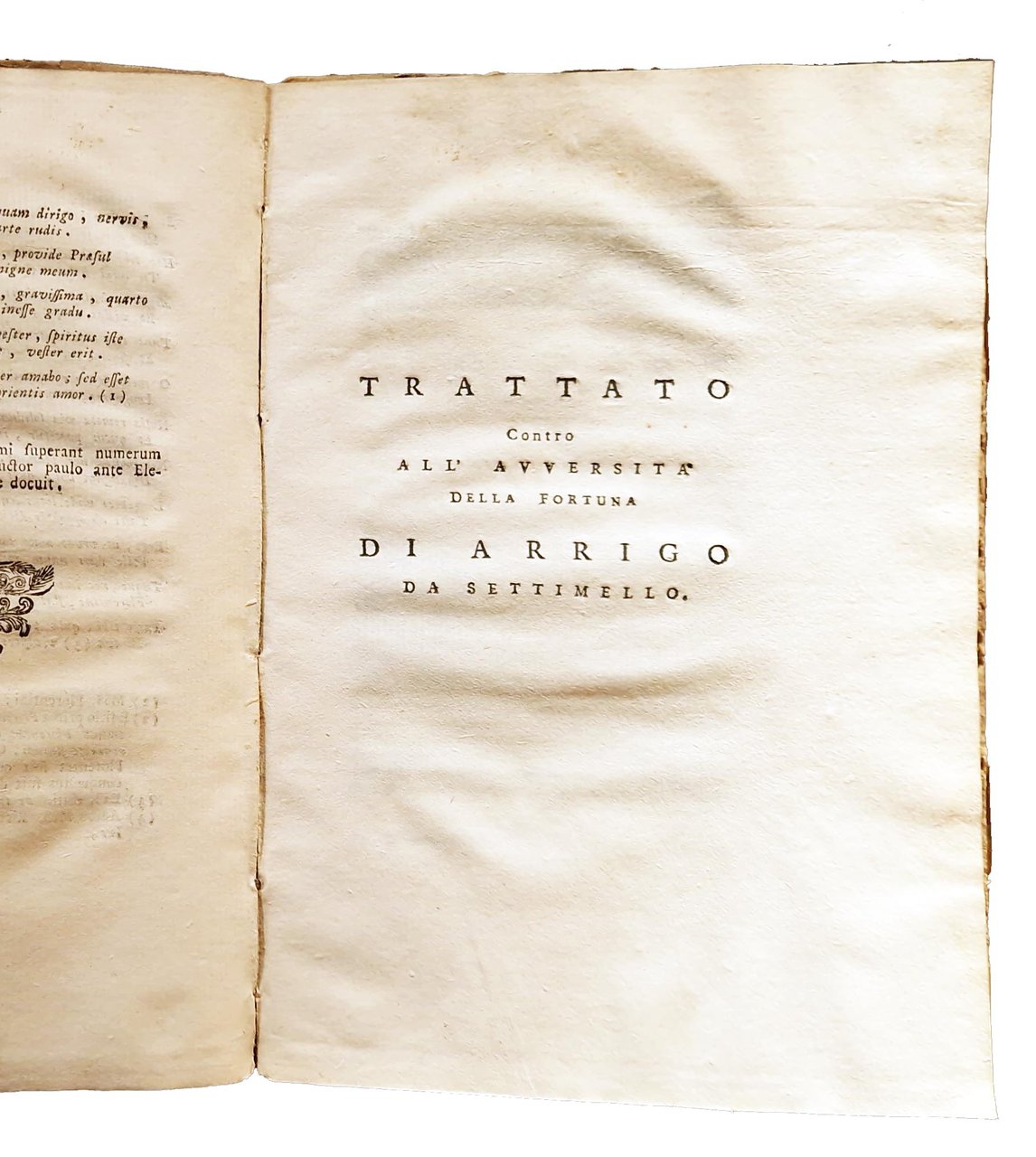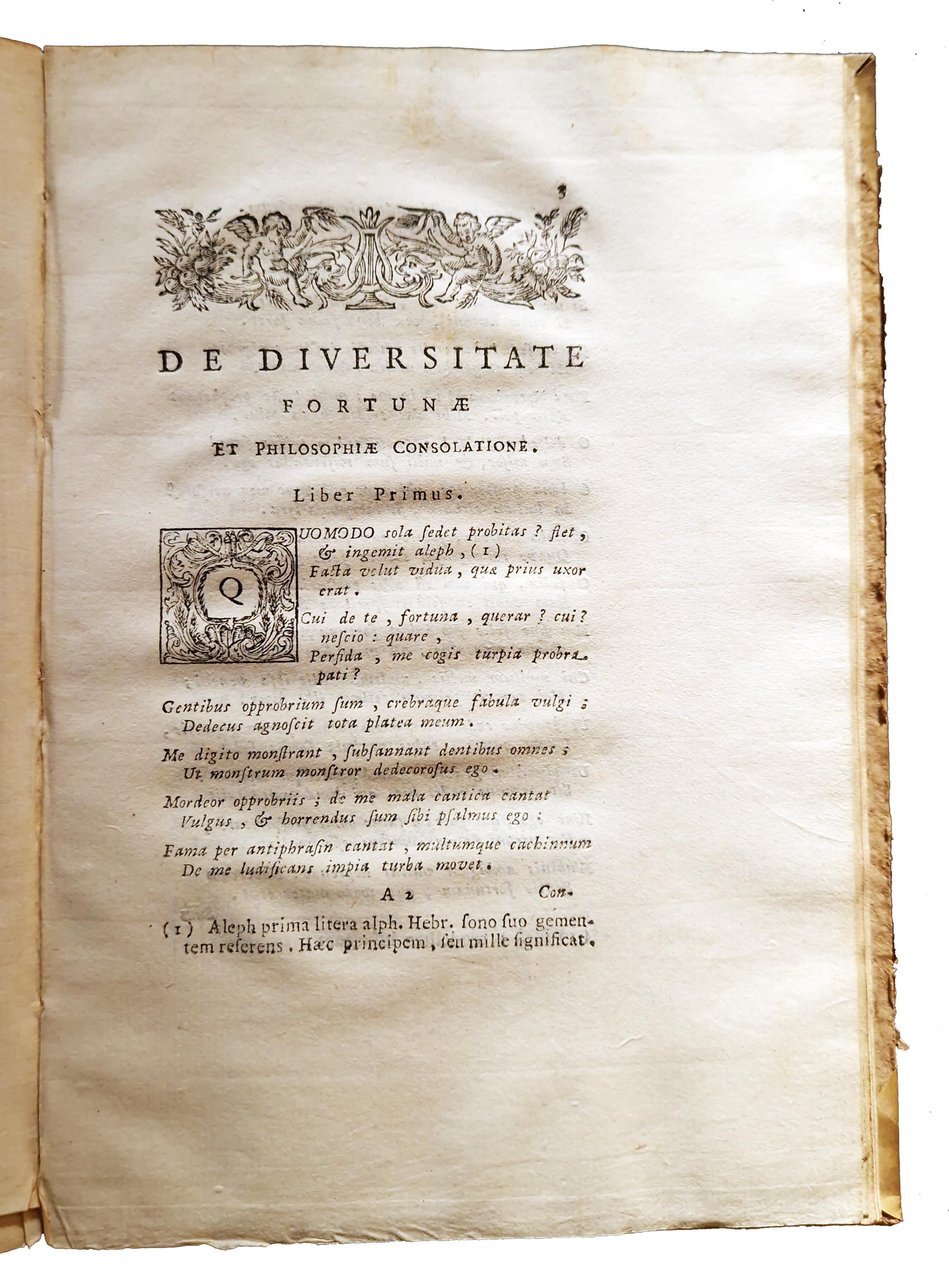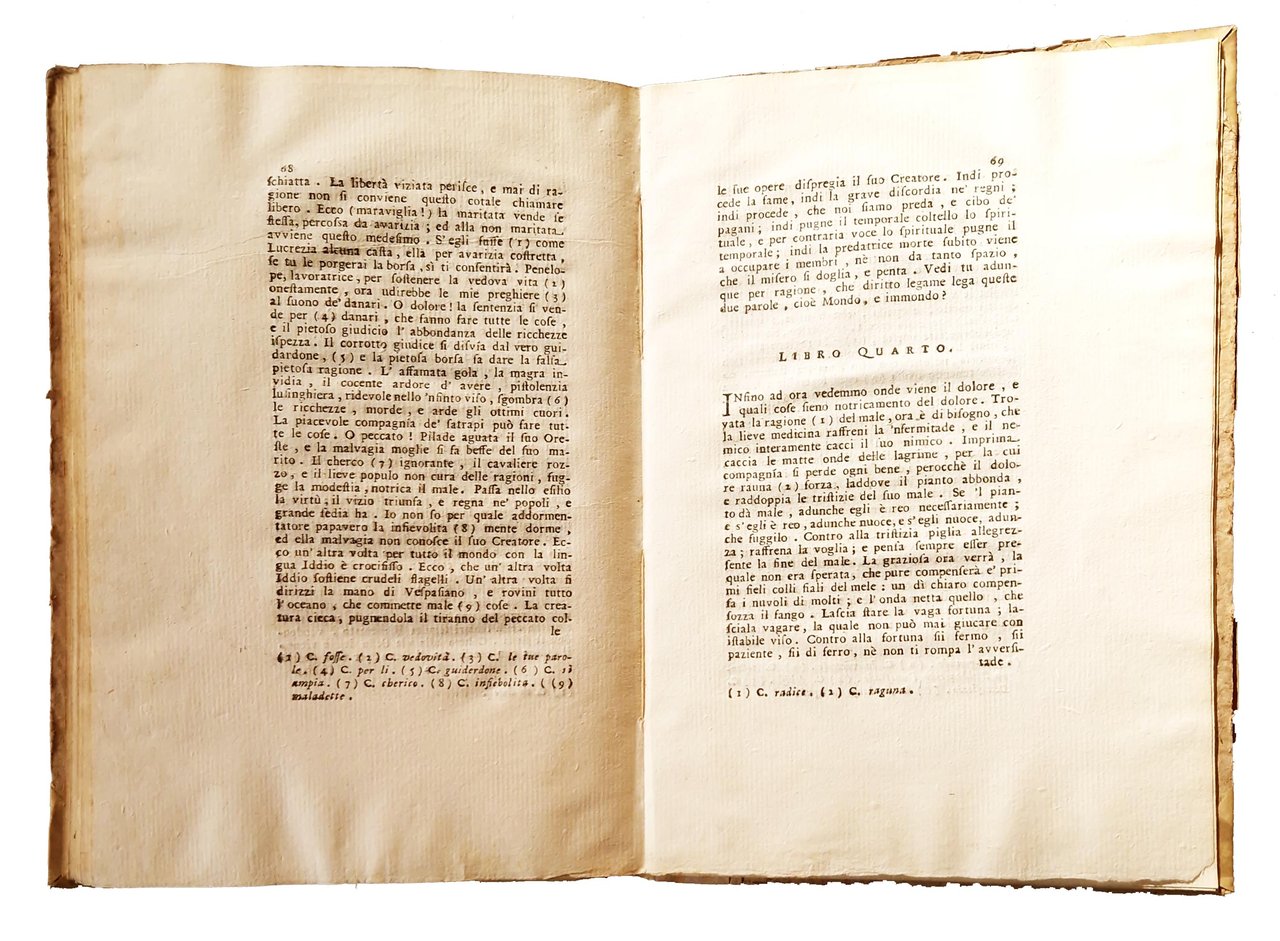 in-8°, 220x150 mm, leg. coeva in mezza peramena con angoli e carta marmorizzata ai piatti; pp. XXIX, [3], 3-77, [3]. Testatine, iniziali e fregi xilografici; vignetta xilografica al frontespizio, raffigurante l'insegna della Crusca (Buratto. Motto: Il piu bel fior ne coglie). Testo in Latino (la prima parte con i Carmina) e in Italiano (la parte del Trattato). A c. A1r occhietto con tit.: Henrici Septimellensis Carmina De diversitate fortunæ et philosophiæ consolatione. A c. F1r occhietto con tit.: Trattato contro all'avversità della fortuna di Arrigo da Settimello. Prima edizione a cura del Manni di questo trattato di Arrigo, ovvero Arrighetto da Settimello, poeta italiano del XII secolo. Quest'opera tratta della volubilità della sorte messa in contrapposizione al fermo e sicuro sollievo che viene dalla filosofia. È composta da mille versi e fu molto popolare nel Medioevo. Il tema è l'instabilità e l'imprevidibilità della Fortuna e della capacità della "filosofia" di "dare all'uomo la coscienza della sua autonomia morale" (Angelo Monteverdi). Rif.: IT\ICCU\RAVE\009560. OCLC, 559582543. Cond.: Lievi tracce d'uso alla legatura (piccole abrasioni alle carte dei piatti). Carte parzialmente in barbe. Piccolo foro a margine del frontespizio. Occasionali bruniture. Esemplare molto buono.