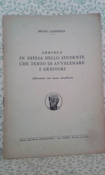 Fascicolo in 8 grande, brossura editoriale, titolo al piatto, frontespizio, prefazione, 35 pp., bianca finale, pubblicit editoriale. Estratto dalla Rivista 'L'Eloquenza'. Dalla prefazione di A. Raffaele Russo: 'mai nelle arringhe che ho letto Bruno Cassinelli mi apparso pi vivo, pi schietto, pi vibrante come qui.'. Davvero un bell' esempio di eloquenza giuridica. In bello stato, non comune.