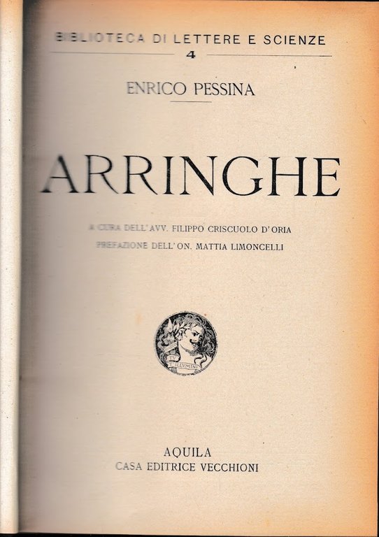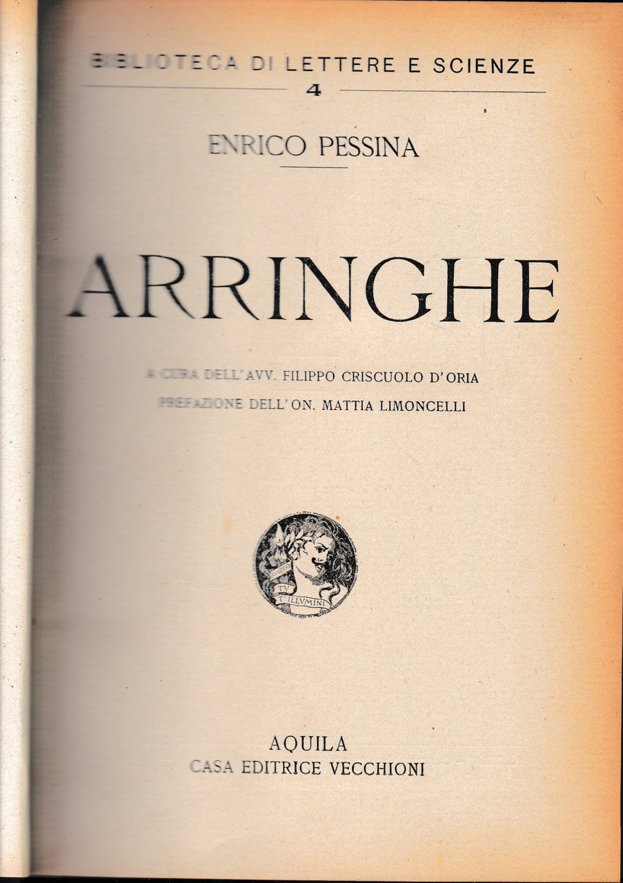 Rilegatura non editoriale. Copertina in mezza pelle con titolo in oro al dorso, piatti marmorizzati. Tagli e pagine ingialliti. Timbro di proprietà precedenti, opera dismessa. Raccolta di arringhe pubblicata nel centenario della nascita. Collana: "Biblioteca di lettere e scienze/4". rigida XXIII+416 Buono (Good) .