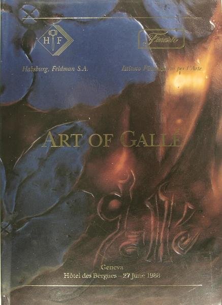 Genève, 1988. In/4 percaline bordeaux sous jaquette illustrée en couleur, illustrations en couleur pleines pages dont deux dépliantes, 196 p. Texte en anglais et en japonais.Catalogue d’une vente du 27 juin 1988 présentant 108 pièces de Gallé.