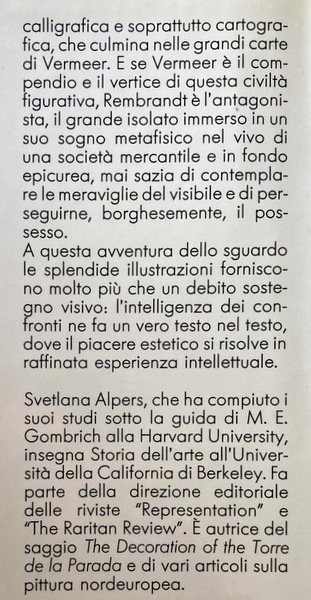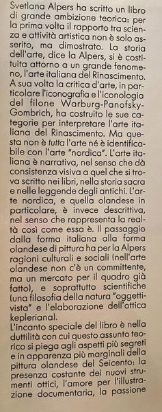 Svetlana Alpers ha scritto un libro di grande ambizione teorica: per la prima volta il rapporto tra scienza e attività artistica non è solo asserito, ma dimostrato. La storia dell'arte, dice la Alpers, si è costituita attorno a un grande fenomeno, l'arte italiana del Rinascimento. A sua volta la critica d'arte, in particolare l'iconografia e l'iconologia del filone Warburg-Panofsky-Gombrich, ha costruito le sue categorie per interpretare l'arte italiana del Rinascimento. Ma questa non è tutta l'arte né è identificabile con l'arte "nordica". L'arte italiana è narrativa, nel senso che dà consistenza visiva a quel che si trova scritto nei libri, nella storia sacra e nelle leggende degli antichi. l'arte nordica, e quella olandese in particolare, è invece descrittiva, nel senso che rappresenta la realtà cosi come essa è. Il passaggio dalla forma italiana alla forma olandese di pittura ha per la Alpers ragioni culturali e sociali (nell'arte olandese non c'è un committente, ma un mercato per il quadro già fatto), e soprattutto scientistiche (una filosofia della natura "oggettivista" e l'elaborazione dell'ottica kepleriana).