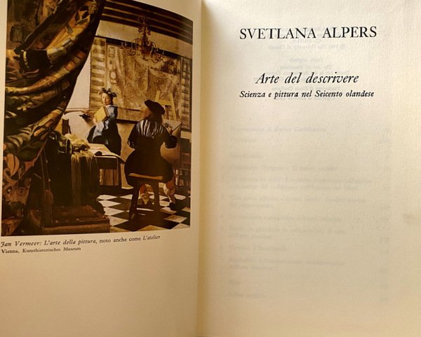 Soggetti: Arte, Pittura, Pittori, Pittrici olandese, Paesi Bassi, Realismo, Europa del Nord, Biografie, Storia, Memorie, Opere generali, Studi culturali, Critica, Dipinti, Quadri, Arti Grafiche, Disegno, Incisione, Miniatura, Saggi, Filosofia, Libri rari, Libri Illustrati, Libri Vintage Fuori catalogo, Collezionismo, Da collezione, Iconologia, Realtà descrittiva, Bibliografia, Rarità, 1400-1800, XV-XVIII), Rinascimento, Pittura olandese, Secolo diciassettesimo, Seicento, Gusto, Sensibilità, Lettura, Interpretazione, Analisi, Dipingere, Descrizioni, Maestri olandesi, Arte italiana, Differenze culturali, Riferimento, Cultura testuale, Simbolismo, Osservazione, Italia, Classicità, Giorgio Vasari, Teorici Rinascimentali, Cultura visiva, Erwin Panofsky, Ernst Gombrich, Caratteristiche, Significato, Religione, Etica, Protestantesimo, Chiesa, Libertà, Dibattiti, Intellettuali, Metodi, Giudizio artistico, Valore, Arte de Descrever: A Arte Holandesa no Século XVII, Scoperte geografiche, Nuovo Mondo, Americhe, America, Jan Vermeer, Rijn van Rembrandt, Autoritratto, Ritratti, Conversazioni, Abramo e Isacco, Soggetti biblici, Cartografia, Mappe, Geografia, Keplero, Scienza, Rappresentazione, Iconografia, Immaginario, Estetica, Constantijn Huygens, Modello Kepleriano, Tecnica, Vocazione cartografica, Firenze, Toscana, Mecenatismo italiano, Corti, Committenze, Papa, Vaticano, Casate nobiliari, Medici, Reimbrond Vainrein, Amsterdam, Rotterdam, Filippo Baldinucci, Hendrik Vroom, Province Unite, Mercato, Ronda di Notte, Antonio Ruffo di Calabria, Guercino, Rubens, Ultrajectenses, Utrecht, Abraham Bloemaert, Terbrughen, Manierismo, Caravaggio, Bamboccianti, Pieter van Laer, Breenberch, Poelenburg, Journey to Flanders and Holland, Haarlem, Francisco de Zurbaran, Pieter Saenredam, Jacob Matham, Thomas de Keyser, Dirck Hals, Donne, Prospettiva, Carte geografiche, Chorographia, Pietro Apiano, Commercio, Società mercantile, Imprenditori, Affari, Capitalismo, Borghesia, Visscher, Velázquez, Spranger, Steenwyck, Tolomeo, Las Meninas, La resa di Breda, Donna con la bilancia, Merlettaia, Mestieri, Vedute, Paesaggio, Suonatrice di chitarra, Vignola, Jacob Matham, Fabbrica di birra, Gerardo Mercatore, Atlante, Gabriel Metsu, Jan van Eyck, Gheyn, Goltzius, Robert Hooke, Hoogstraten, Bacone, Drebbel, Scritti, Figurazione pittorica, Johns Jasper, Willem Kalff, Natura morta, Leonardo da Vinci, Pieter Lastman, Pieter Brueghel, Golfo di Napoli, Mesi, Proverbi, Peter Burke, Camera oscura, Jacob Cats, Comenio, Comenius, Opera didattica, Gerrit Dou, Orbis pictus, Eugene Fromentin, I coniugi Arnolfini, Madonna con il canonico van der Paele, Albrecht Durer, Coniglio, Malinconia, Leon Battista Alberti, Proporzioni, Narrativa, Barentsz, Porto di Genova, Bacone, Novum Organum, van Stolk, Caertboek, Soggetto epistolare, Calligrafia, Parole, Lettere, Warburg, Arte nordica, Passione, Strumenti ottici, Elaborazione dell'ottica, Illustrazione documentaria, Libri introvabili, Art, Painting, Painters, Dutch Painters, Netherlands, Realism, Northern Europe, Biographies, History, Memories, General Works, Cultural Studies, Criticism, Paintings, Pictures, Graphic Arts, Drawing, Engraving, Miniature, Essays, Philosophy, Books Rare, Illustrated books, Out of print books, Collectibles, Collectibles, Iconology, Descriptive reality, Bibliography, Rarity, Renaissance, Dutch painting, Seventeenth century, Seventeenth century, Taste, Sensitivity, Reading, Interpretation, Analysis, Paint, Descriptions, Dutch masters, Italian art, Cultural differences, Reference, Textual culture, Symbolism, Observation, Italy, Classicism, Renaissance Theorists, Visual culture, Characteristics, Meaning, Religion, Ethics, Protestantism, Church, Freedom, Debates, Intellectuals, Methods, Artistic judgment, Value, Geographical discoveries, New World, Americas, Self-portrait, Portraits, Conversations, Abraham and Isaac, Biblical subjects, Cartography, Maps, Geography, Science, Represent Action, Iconography, Imaginary, Aesthetics, Keplerian model, Technique, Cartographic vocation, Florence, Tuscany, Italian patronage, Courts, Clients, Pope, Vatican, Noble houses, United Provinces, Market, Night watch, Mannerism, Women, Perspective, Cards Geographical, Commerce, Merchant society, Entrepreneurs, Business, Capitalism, Bourgeoisie, The surrender of Breda, Woman with the balance, Lace maker, Professions, Views, Landscape, Guitar player, Brewery, Atlas, Writings, Pictorial figuration, Still life, Gulf of Naples, Months, Proverbs, Camera obscura, Didactic work, The Arnolfini spouses, Rabbit, Melancholy, Proportions, Narrative, Port of Genoa, Letter subject, Calligraphy, Words, Literature, Nordic art, Passion, Optical instruments, Optics processing, Documentary illustration, Hard to find books