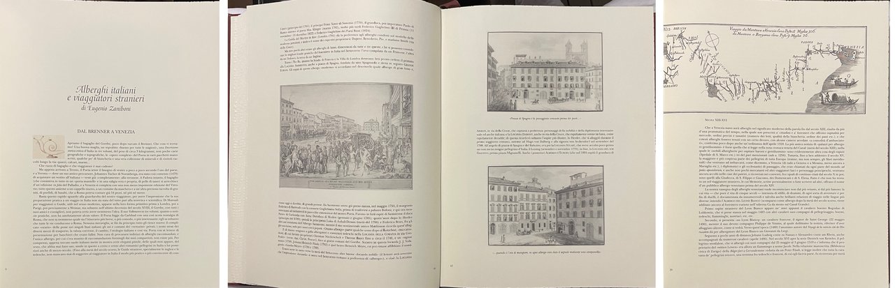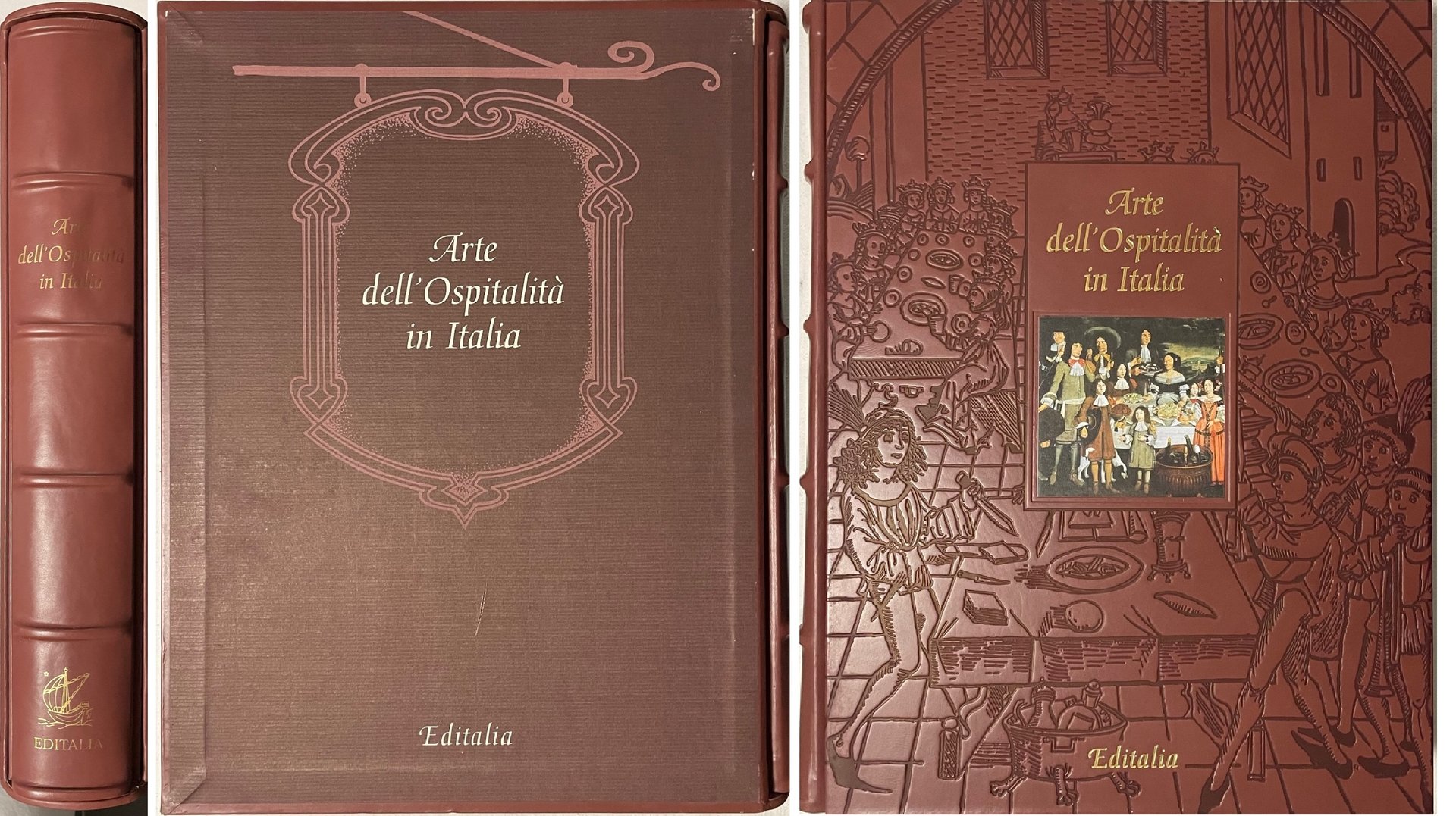 Arte dell'Ospitalità in Italia. Editalia, Roma, 2004. Presentazione di Stefano Bonilli. Alberghi, Ristoranti, Luoghi ameni, Passeggiate descritti da vari autori. Legatura in pelle con impressioni in oro e pastello. Sul primo piatto stampa in quadricomia. Cofanetto di custodia in mezza pelle con scritte. Tiratura limitata e numerata di 1999 copie. Condizione ottima.