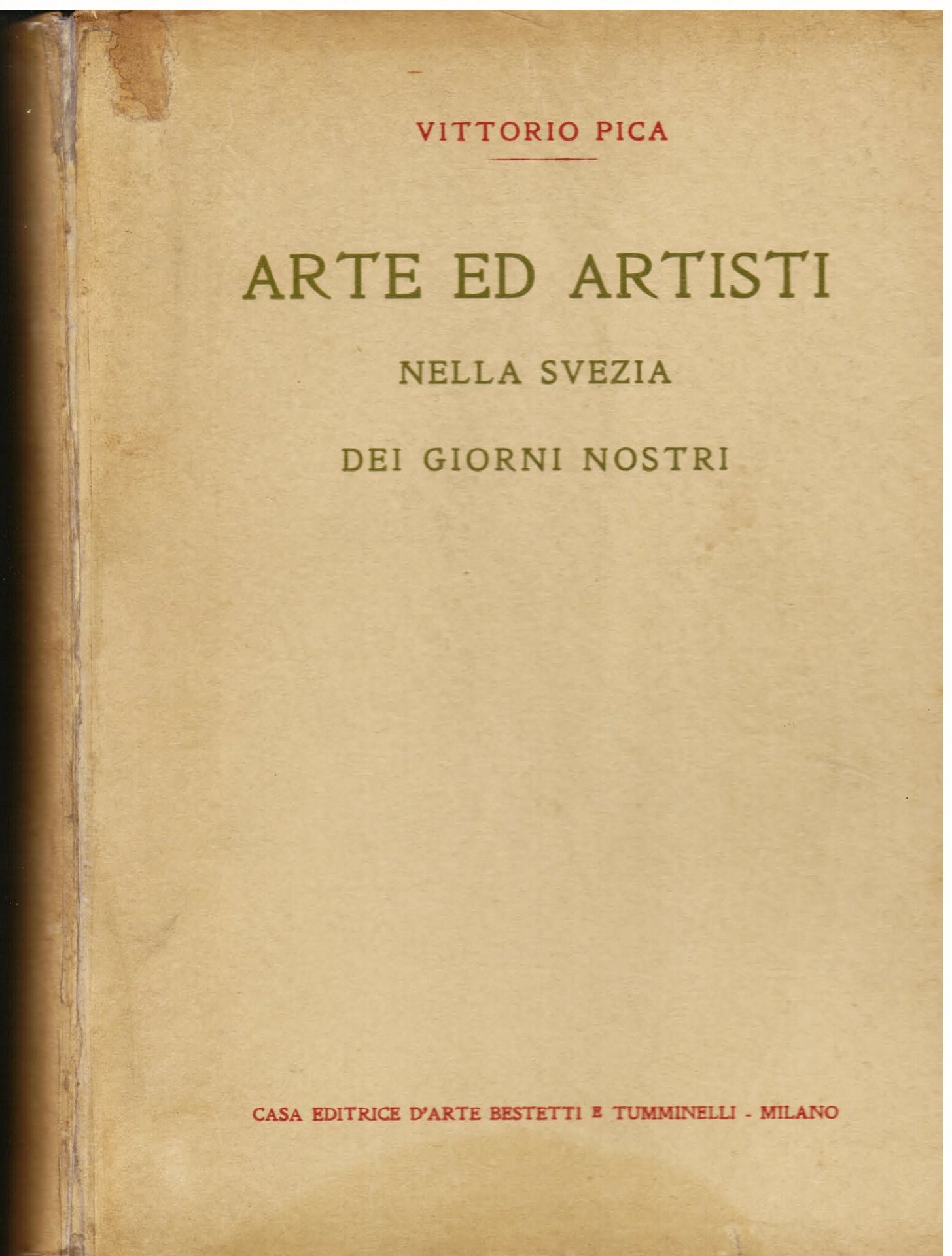 In-8° grande (26.5x20) cartonatura rigida editoriale con titoli a due colori al dorso e al piatto anteriore. Pp 510, 259 illustrazioni nel testo e 10 tavole fuori testo. Restauri alle cuffie, alcuni minimi aloni al dorso, internamente perfetto. Una firma di possesso al foglio di guardia anteriore. Buon esemplare. Prima edizione della più compiuta rassegna critica scritta in Italia al tempo sulle arti figurative, decorative, applicate e sull'architettura nella Svezia di inizio secolo. Il Pica (Napoli, 1864 - Milano, 1930), fu scrittore d'arte che concorse a sprovinciallizare la critica artistica italiana del proprio tempo, aprendola in modo decisivo a correnti figurative estere prima poco note o affatto sconosciute nel nostro paese. Collaboratore e poi direttore della rivista Emporium, unico periodico italiano d'arte moderna fra '800 e '900, fu un fervido sostenitore di un'arte italiana aggiornata sulla maggiori tendenze europee. In quest'ottica fu uno dei più attivi promotori delle varie Biennali (in testa a tutte quella di Venezia) che si allestirono dall'inizio del secolo per approfondire i rapporti fra pittura italiana e pittura d'oltralpe.