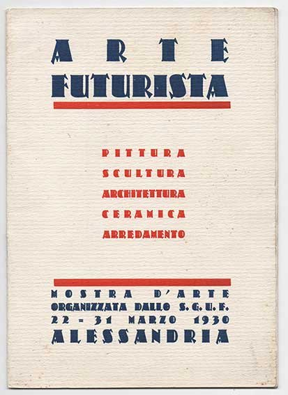 LIBROEdizione originale.Ottimo esemplare.Catalogo della mostra 22-31 marzo 1930 ad Alessandria. Curiosa grafica tra déco e scuola di Torino. Elenco degli espositori a p. [3]: Brescia, Diulgheroff, Fillia, Mazzotti, Oriani, Portalupi, Pozzo, Rosso, Saladin, Sartoris, Zucco. Prefazione di Marinetti, che ristampa il testo già edito per il catalogo ‘Trentatré pittori futuristi’ alla Galleria Pesaro (ott. 1929) — quello dove a strapaese e stracittà si contrappone «stracielo!», violento attacco ai novecentisti, agli ex Soffici e Carrà (e Sironi, ridimensionato), e glorificazione dei nuovi pilastri Depero, Prampolini, Dottori, i circumvisionisti napoletani e i pittori milanesi — aggiungendovi un cappello più ampio sul gruppo torinese. Postfazione senza titolo di Fillia, qui sembra in edizione originale, che fa il punto storico sul futurismo legandolo indissolubilmente al fascismo, e chiude esaltando «l’architettura vertice della potenza, della solidità, della ricchezza, del lavoro e del genio di un popolo» e chiedendo più spazio all’avanguardia in architettura. Belle riproduzioni di opere a piena pagina: Fillia (Dramma umano), Pozzo (Danze russe), Diulgheroff (Città grigia; progetto di villa), Oriani, (Residui di romanticismo), Zucco (Avventurieri), Brescia (Composizione), Rosso (Giuocatori di foot-ball), Sartoris (gruppo di centrali editrici), Portalupi (mobili futuristi).Bibl.: Nuovi archivi del futurismo, I, 1930b