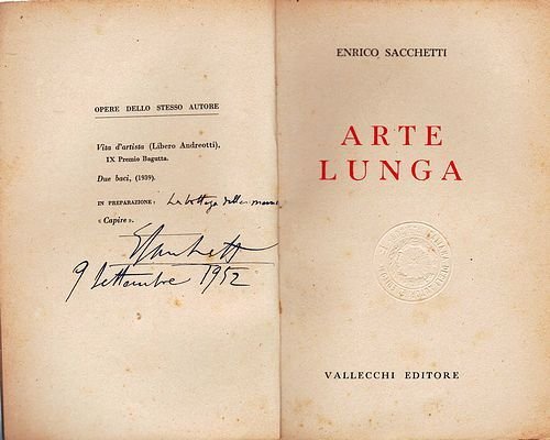 Importante copia con molte correzioni e commenti dello stesso Sacchetti apportati in più date, il che determina il passaggio del libro tra le mani in più fasi, per appuntare pensieri, e ripetute firme autografe e un disegno a lapis a pagina 98. Copia mancante di una pagina, e della brossura anteriore, dorso fatto con incollaggio di modesta carta. (Copia da collezione memoriale nel ricordo dell'artista scrittore). -(Enrico Sacchetti)-Nasce a Roma il 28 febbraio 1877. Caricaturista, pittore, illustratore e cartellonista di origine toscana, dopo il diploma in fisica-matematica conseguito nella capitale ritorna a Firenze, dove fa amicizia con Libero Andreotti. Nel 1901 collabora al Bruscolo di Vamba e a La Nuova Musica, finché decide di tentare la fortuna a Milano. Come racconterà egli stesso, 'a Firenze Libero Andreotti e io s'è patito parecchia fame, ma quando ci si trasferì a Milano le cose andarono meglio e per un pezzo si mangiò tutti i giorni'. Collabora dunque con il settimanale satirico milanese Verde e azzurro di Umberto Notari, per il quale realizza nel 1903 anche il manifesto di lancio, e con il quindicinale Teatro illustrato del 1905; nello stesso anno illustra 'Le Roi Bombance' ('Re Baldoria') di Filippo Tommaso Marinetti, il padre del futurismo, e collabora con la sua rivista Poesia. Ancora per Umberto Notari illustra il suo libro 'Quelle signore', insieme a Cesare Tallone e a Ugo Valeri. Si trasferisce a Buenos Aires (Argentina) dal 1908 al 1911, dove collabora con il quotidiano El Diario. Nel 1912 raggiunge in Francia l'amico Libero Andreotti, e lavora soprattutto per la moda. Ritorna in Italia allo scoppio della guerra, e lavora per la propaganda antiaustriaca collaborando con il settimanale Numero e con il 420, realizzando anche numerose cartoline satiriche. Verso la fine del conflitto è tra gli autori de La Tradotta, il famoso 'giornale della Terza Armata', per il quale realizza numerose copertine e illustrazioni. Collabora poi con il Corriere dei piccoli e La lettura, due periodici del quotidiano Corriere della sera. E' molto apprezzato anche nella cartellonistica pubblicitaria, dove si deve ricordare almeno il manifesto del 1921 per il Bitter Campari. Collabora, fino al secondo conflitto mondiale, con testate come L'Illustrazione italiana e Liedel, mentre vastissima è la produzione per il mercato librario: illustra infatti volumi editi da Mondadori, Sonzogno, Zanichelli. Dagli anni Venti scrive articoli e libri, come 'Vita d'artista' (1935, il suo primo libro, vincitore del IX Premio Bagutta) e 'Due baci' (1935). Durante la guerra perde il figlio Dino, caduto in Albania, e gli dedica il libro 'Arte lunga' (Vallecchi, 1941). Nel dopoguerra scrive ancora 'Capire' (1948), 'La bottega della memoria' (Vallecchi, 1953), 'Che cosa è l'arte' (Vallechi, 1954?) e 'Il disegno e il disegnatore'. Nonostante le manifestazioni di apprezzamento e la notorietà, la sua vita si trascina solitaria fino a tarda età, e a novantun anni vi pone fine tragicamente. Muore a Settignano (Firenze, Italia) il 27 dicembre 1967.