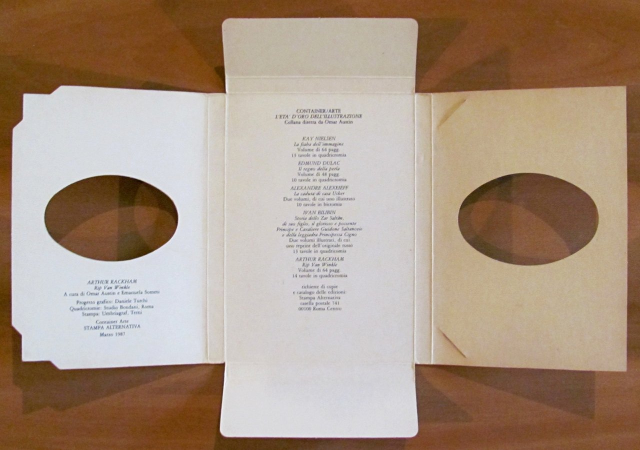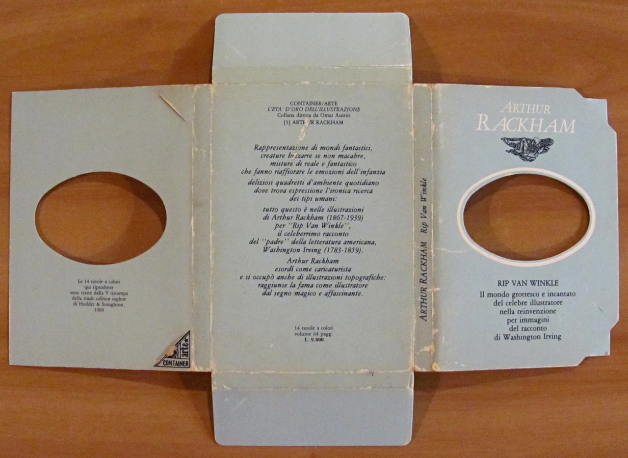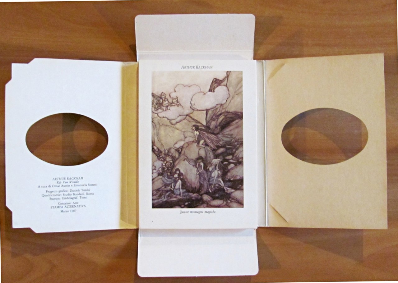 A cura di Omar Austin e Emanuela Sommi. Arthur Rackham illustra Rip Van Winkle di Washington Irving. Collana L'età d'oro dell'illustrazione. 14 splendide cartoline a colori sciolte (tratte dalla ristampa della trade edition inglese di Hooder & Stoughton,1909), e illustrazioni in b/n n.t. nel libretto, tutte di Arthur Rackham. Ed. Stampa Alternativa - Roma, Marzo 1987. Cofanetto editoriale in cartone contenente 14 tavole sciolte, stile cartolina, e libretto in brossura. Lievissime abrasioni el tempo al dorsodel solo cofanetto. Tavole e libretto in Stato di Nuovo. 11x15; pp.64 + 14 tavole. Ottimo stato. , Ottimo (Fine)