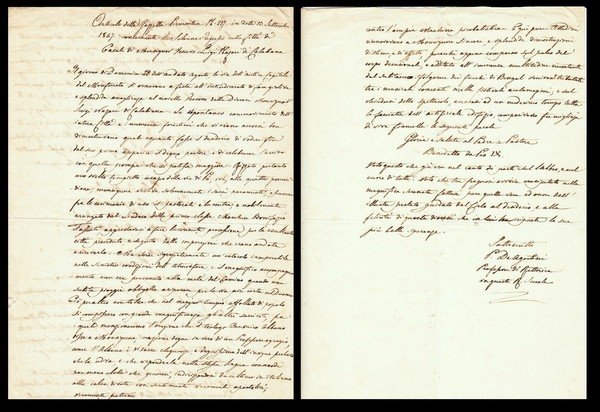 manoscritto di 4 pp. sull'ingresso del Vescovo Luigi Nazari di Calabiana a Casale Monferrato scritto da "P. De Agostini professore di Rettorica in queste R. Scuole"; buon es.