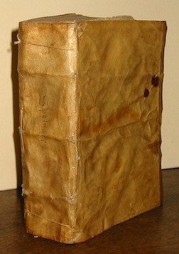 8vo (cm. 15), 352 cc., 4 cc.nn. Al frontespizio e in fine, marche tipografiche raffiguranti l’Arcangelo Raffaele con un bambino ed un cane. Legatura coeva in piena pergamena floscia (usurata e macchiata) con nervetti al dorso. Difetti alle carte di guardia. Ottimi interni. Raro. Non in Sapori. Non in Adams.