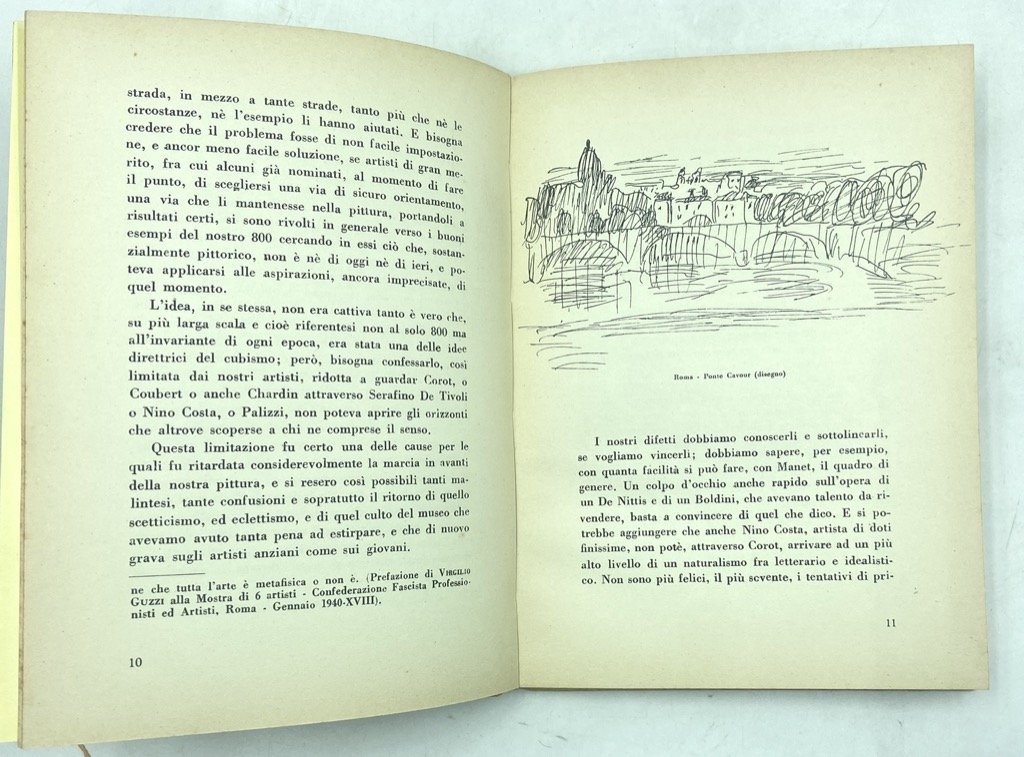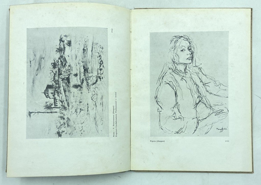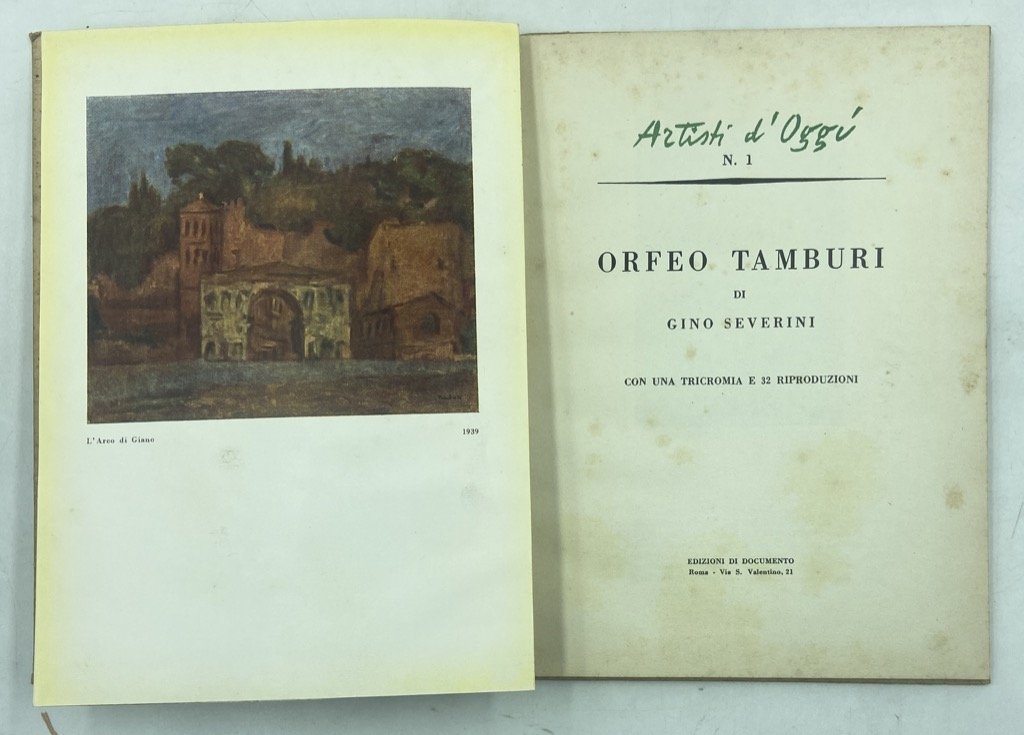 Legatura editoriale cartonata con dorso in tela e piatti decorati a stampa, cm 19 x 14, pp 27 (5) + (28) di tavole, illustrazione a colori applicata all'antiporta, ritratto dell'artista e 4 riproduzioni di disegni in nero nel testo, 28 disegni e dipinti riprodotti in nero su tavole patinate. Collana Artisti d'Oggi, numero 1. Buono stato, qualche arrossamento. Edizione originale, stampata dalle Nuove Grafiche S.A. di Roma il 28 ottobre 1941, della monografia inaugurale della collana Artisti d'Oggi della raffinata Anonima Documento Editrice di Federico Valli, protagonista di un'effimera quanto interessante stagione nei primi anni Quaranta sotto le insegne di Documento e de La Margherita. Il pittore Orfeo Tamburi (Jesi 1910 - Paris 1994), oggetto di questo studio, fu con Francesco Grandjaquet curatore della collana. Testo critico, con nota bibliografica, di Gino Severini e apparato iconografico che riproduce opere del periodo 1935-1941.