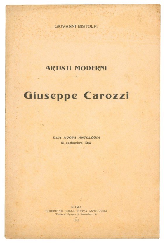 Mm. 248x164. Pp. 10, [2] cc. con fotografie in b/n. C. lievemente ed uniformemente brunita. Brossura editoriale con titolo alla cop. ant. (lievemente fiorita la brossura). Prima ed unica edizione, appartenente alla 'Nuova antologia di lettere, scienze ed arti', Serie 5 v. 167 1913, pp. 245-252.