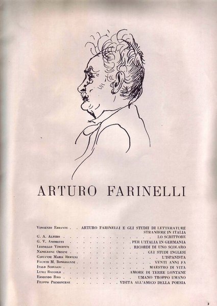 Fascicolo in folio, brossura editoriale, titolo al piatto, occhiello, frontespizio con illustrazione al tratto del soggetto, 22 pp., 1 tavola con illustrazione fotografica di fac-simile di appunti dello scrittore, bianca. Undici interessanti articoli tratti dalla rassegna mensile municipale di Torino dedicati allo studioso di letterature tedesche, inglesi ed ispaniche, Un doveroso omaggio da parte di autori quali G.A. Alfero, G.V. Amoretti, Leonello Vincenti, Napoleone Orsini, G.M. Bertini, Fausto M. Bongioanni, Italo Scovazzi, Luigi Baccolo, Edmondo Rho, Filippo Piemontese. In ottime condizioni.
