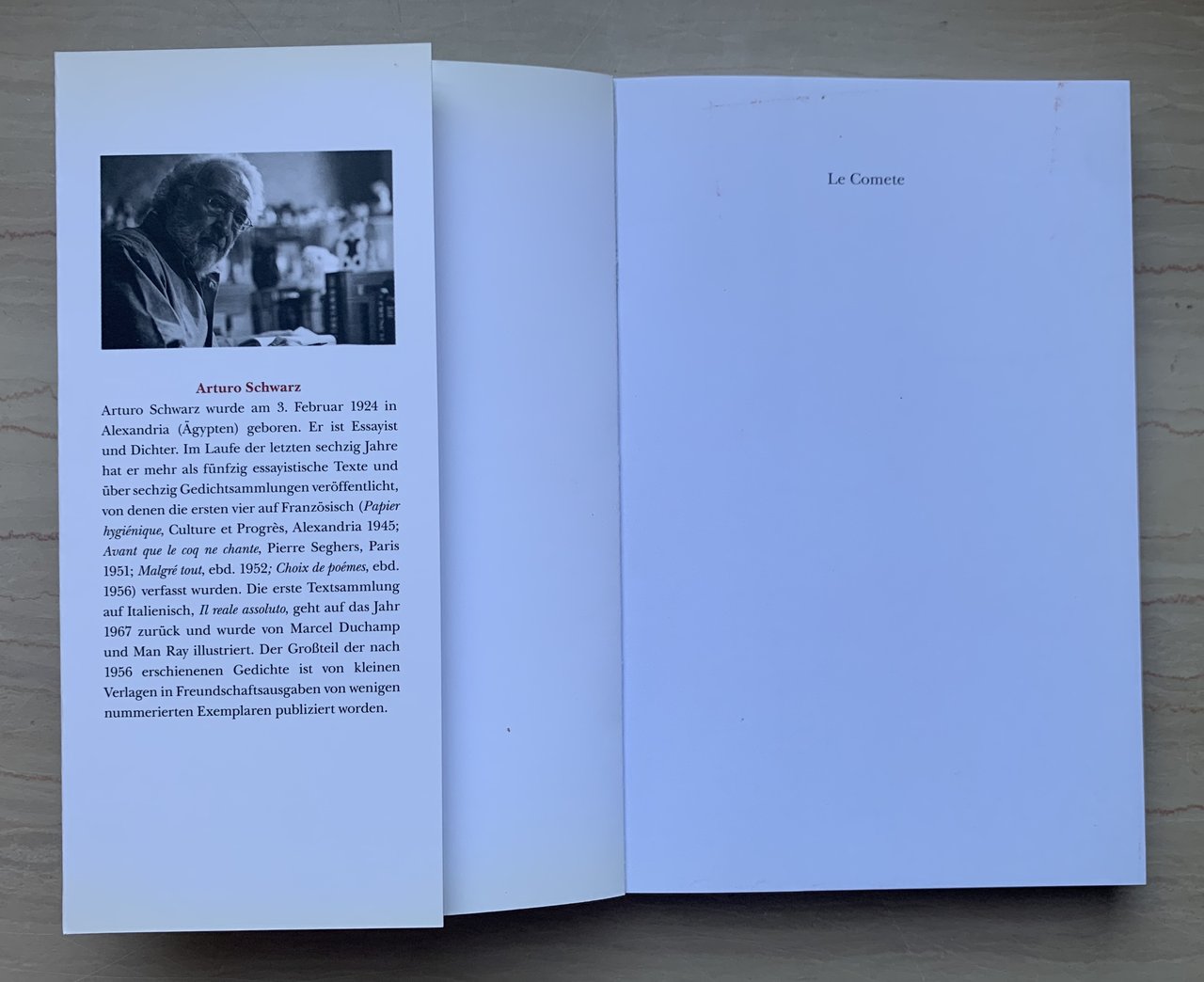 I ed. tedesca: gennaio 2017 (ed. originale: Arturo Schwarz. Il coraggio della verità: correlazioni empatiche, Torino, Lindau 2015). Übersetzung des italienischen Textes: Andreas Wilhelm und Dr. Giorgio F. Alberti. Vorwort und Logo Alchimiarte Giorgio F. Alberti. Collana Le Comete. Testo in tedesco. VIII/216/ brossura satinata con risvolti (Úmschlag (Cover): Arturo Schwarz. Illustrazioni fotografiche in b/n f.t.. Fotos: Alberto Navarra © Courtesy Archivio Storico De Domizio Durini. Stato molto buono.