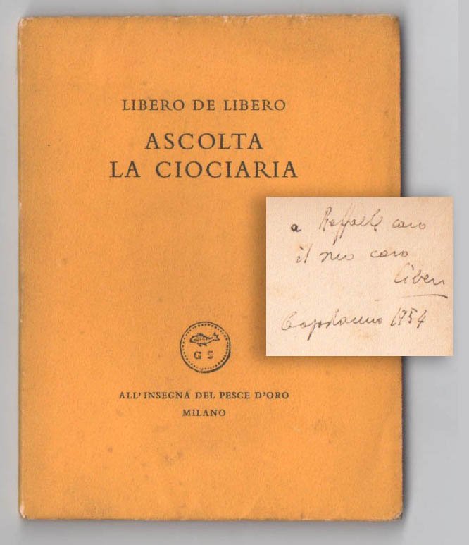 LIBROPrima edizione Scheiwiller.CON AUTOGRAFO.Copia n. 132/500 pregiata dalla dedica autografa dell’autore a Raffaele Carrieri. Lievi bruniture e fioriture, ma ottimo esemplare.Seconda edizione, prima per Scheiwiller. Tiratura di 500 copie numerate più 50 copie su carta japon numerate da I a L per gli amici del libro. Raccolta scritta per la terra natia (De Libero era nato a Fondi, in Ciociaria, nel 1906) divisa in due suite, la prima intitolata «Creatura celeste» e la seconda eponima «Ascolta la Ciociaria». Raro.