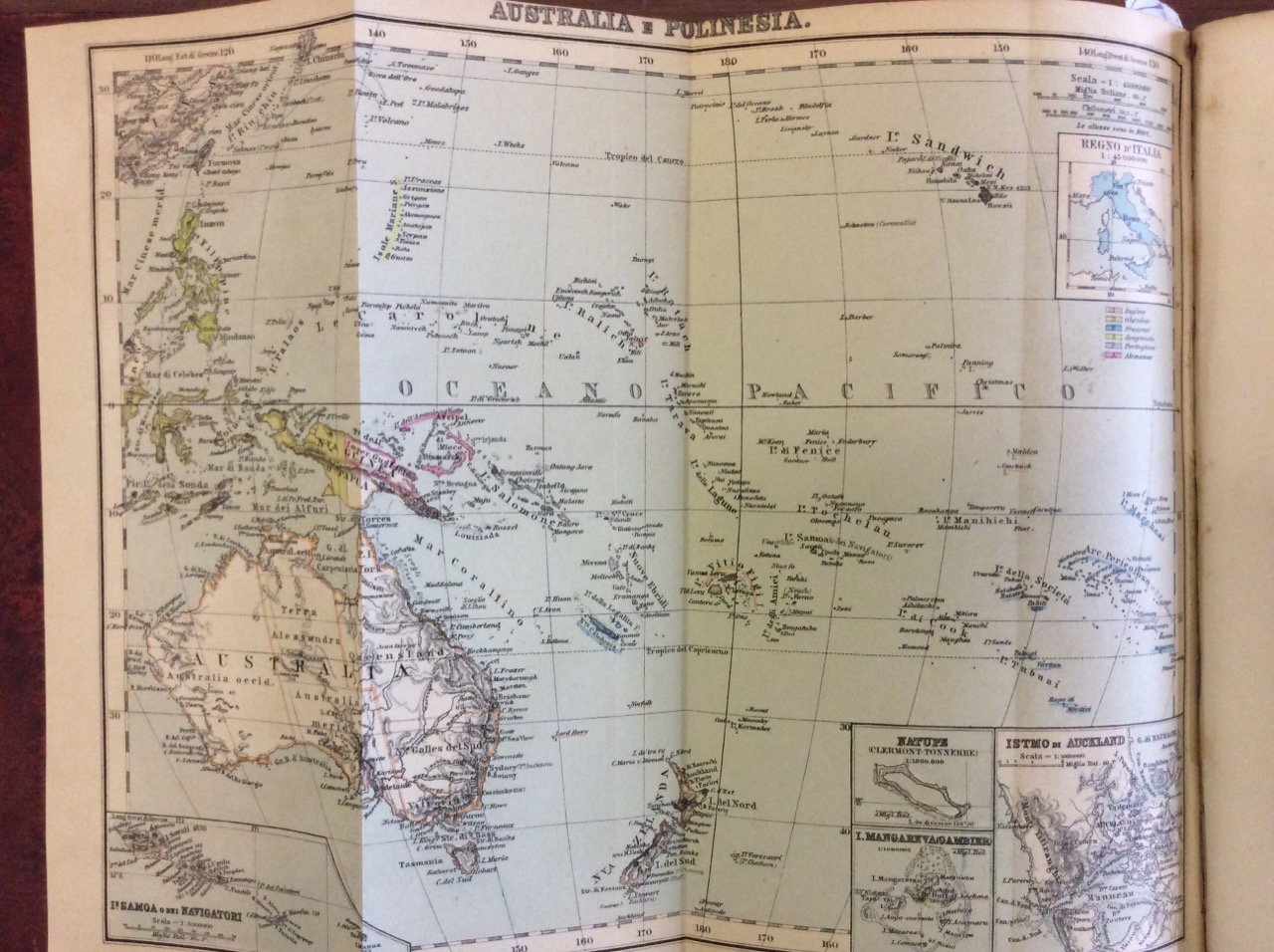 In-8 (mm. 232x150), 2 volumi, mz. pelle coeva (abrasioni), fregi e titolo oro al dorso, con numer. figure nel testo e in tavole fuori testo Nei volumi che offriamo sono stati rilegati (senza rispettare l'ordine) i su indicati continenti, ciascuno completo e con Indice, ma naturalmente con paginazione non consecutiva. Si tratta di:- "Asia" (vol. II, parte II), pp. VII,(2), da 483 a 818, con una Appendice e una carta geografica a colori (a doppia pag.) / "Africa" (vol. I. parte II), pp. VII,(2), da 477 a 728, con una Appendice e una carta geografica a colori (a doppia pag.).- "America Settentrionale" (Parte I, vol. I, Divisione prima), pp. (6),230, con una Appendice e una carta geografica a colori (ripieg.) / "America Centrale e Meridionale" (Parte I, Vol. I, Divisione seconda), pp. VII, da 209 a 502 / "Australia, Oceania e Regioni Polari" (Parte III, Vol. II), pp. VI,(2), da 779 a 868, con una Appendice e una carta geografica a colori (ripieg.).Con arross. e fiorit. ma discreti esemplari.