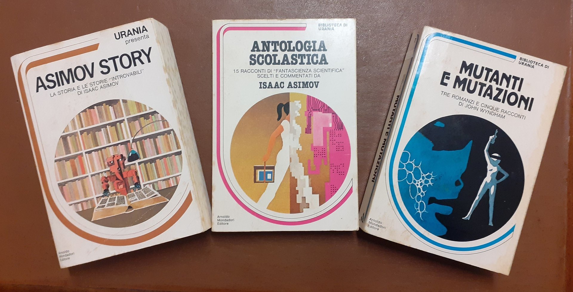 Isaac Asimov, Asimov story. La storia estorie introvabili, Arnoldo Mondadori Editore, s.l. (ma stampato a Cles, presso la Nuova Stampa di Mondadori) 1979, pp. 586, cm 19, br. ed. (Collana Biblioteca di Urania, vol. 3. Titolo originale: The early Asimov. Traduzione di Beata Della Frattina e Hilia Brinis). In lotto con: Asimov et al., Antologia scolastica. 15 racconti di fantascienza scientifica scelti e commentati da Isaac Asimov, Arnoldo Mondadori Editore, s.l. (ma stampato a Cles, presso la Nuova Stampa di Mondadori) 1980, pp. 364, cm 19, br. ed. (Collana Biblioteca di Urania, vol. 6. Titolo originale: Where do we go from here?). In lotto con: John Wyndham, Mutanti e mutazioni. Chocky Il lichene cinese I trasfiguaranti I racconti del tempo, Arnoldo Mondadori Editore, Milano 1980, pp. 514, cm 19, br. ed. (Collana Biblioteca di Urania, vol. 7. Titoli originali: Chocky – Trouble with lichen – Re-birth – Consider her ways, Odd, Random quest, Una, The Wheel. Traduzioni di: Maria Benedetta De Castiglione, Bianca Russo, Hilia Brinis, Cesare Scaglia). Il lotto comprende i tre volumi Asimov story. La storia estorie introvabili, di Isaac Asimov, Antologia scolastica, a cura di Isaac Asimov, e Mutanti e mutazioni, di John Wyndham, tutti nei tipi della Arnoldo Mondadori Editore, collana Biblioteca di Urania, voll. 3, 6 e 7. Supplementi a Urania, nn. 778, 842 e 857. Copertine di Karel Thole. Indici. Asimov story: Introduzione – La minaccia di Callisto – Anello intorno al Sole – Il magnifico possesso – Pendolarità – L’arma troppo terribile per essere usata – Il guardiano della fiamma – Mezzosangue – Il senso segreto – Homo sol – Mezzosangue su Venere – Quantità immaginarie – Ereditarietà – Storia – Natale su Ganimede – L’omino della metropolitana –matricole – Superneutrone – La faccia di Orloff – Fantasma legale – gatto temporale – Diritti d’autore – Condanna a morte – Vicolo cieco – nessuna relazione – Proprietà endocriniche della tiotimolina risublimata – La corsa della regina rossa – Madre Terra. Antologia scolastica: Isaac Asimov, Introduzione – Stanley G. Weinbaum, Odissea su Marte – Don A. Stuart, Notte – Lester del Rey, Gli ultimi arrivati – Milton A. Rothman, Pianetapesante – Robert Heinlein, La casa nuova – Hal Clement, Il Sole è abitato – James Blish, Tensione superficiale – William Morrison, Medico di campagna – jerome Bixby, I buchi di Marte – James E. Gunn, La caverna della notte – Hal Clement, Uno straccio per la polvere – Isaac Asimov, Patè de foie gras – H. Beam Piper, Omnilingue – Walter S. Tevis, Il grande rimbalzo – Larry Niven, Stella al neutronio. Mutanti e mutazioni: Chocky – Il lichene cinese – I trasfiguranti – I racconti del tempo (Considerasue vie – Il lascito – Problema di identità – Una – La ruota). Residuo di piccola etichetta adesiva rimossa al dorso di ciascun volume, leggere tracce d’uso, fioriture, lieve ingiallitura della carta, per il resto esemplari ben conservati.