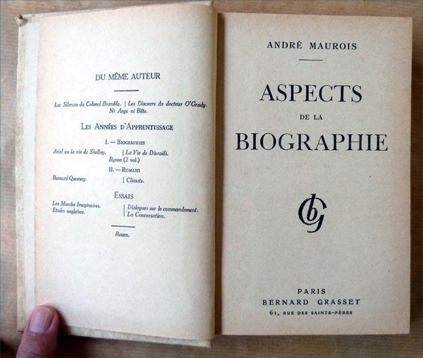 Un volume de format petit in 8° de 264 pp.; reliure cartonnée de l'éditeur jaune paille; décor au dos. Il manque peut-être une jaquette. Texte rare. La part la plus importante de l'oeuvre de Maurois est constituée de biographies. Bon état. Voir la photo.