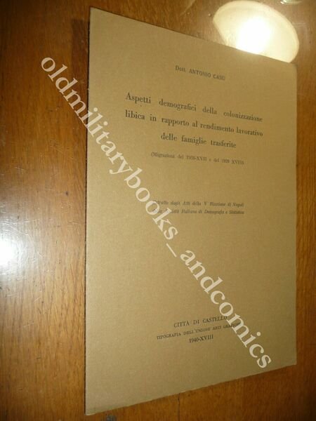 TITOLO: ASPETTI DEMOGRAFICI DELLA COLONIZZAZIONE LIBICA IN RAPPORTO AL RENDIMENTO LAVORATIVO DELLE FAMIGLIE TRASFERITE DESCRIZIONE: Unione Arti Grafiche Città di Castello 1940, br. ed. pp. 7 in 8°. CONDIZIONI: Ottime. PESO / WEIGHT: 100 gr. without package