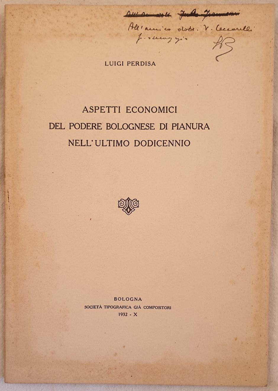 Edizione del 1932 di questa monografia sugli aspetti economici del podere bolognese di pianura nel periodo dal 1919-1930 scritto da Luigi Perdisa. Estratto dalla rivista "Risparmio e credito nella Regione Emiliana" n. 1-2 Gennaio febbraio 1932. Dedica in copertina. In ottime condizioni. Copertina editoriale in ottime condizioni generali con lievi usure ai margini e dorso. Legatura in buone condizioni. All'interno le pagine si presentano in ottime condizioni con rare fioriture. In 8. Dim. 24,5x17,5 cm. Pp. 29. Edition of 1932 of this monography about economical aspects of Bologna property in plains during the peirod from 1919 to 1930 written by Luigi Perdisa. Extract from the magazine "Risparmio e credito nella Regione Emiliana" n. 1-2 January february 1932. Dedication in the cover. In very good conditions. Editorial cover in very good conditions slightly worn in the edges and spine. Binding in good conditions. Inside pages are in very good conditions with occaisonal foxings. In 8. Dim. 24,5x17,5 cm. Pp. 29.