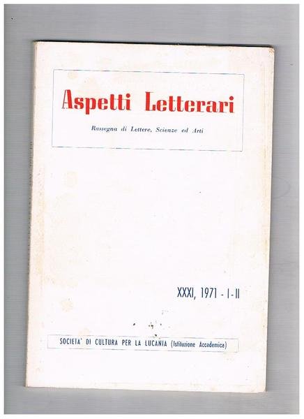 Aspetti letterari, rassegna di lettere scienze ed arti n° 1-2 del 1971 della società du cultura per la Lucania. Contiene: articoli su le celebrazioni lucane Francesco Torraca e Lamanna Paolo E.