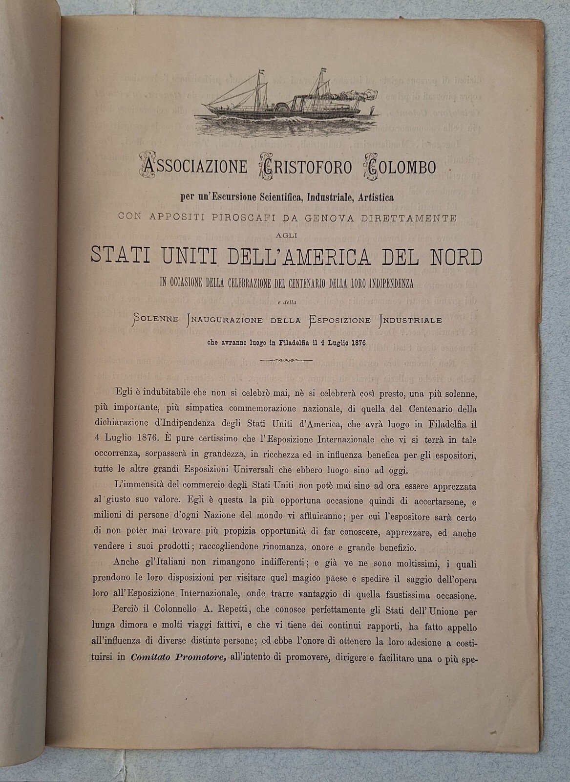 ASSOCIAZIONE CRISTOFORO COLOMBO PER UN'ESCURSIONE SCIENTIFICA INDUSTRIALE ARTISTICA CON APPOSITI PIROSCAFI DA GENOVA DIRETTAMENTE AGLI STATI UNITI NORD IN OCCASIONE DELLA CELEBRZIONE DEL CENTENARIO DELLA LORO INDIPENDENZA .... IN FILADELFIA 1876TIP. SOCIALE S. RADEGONDA