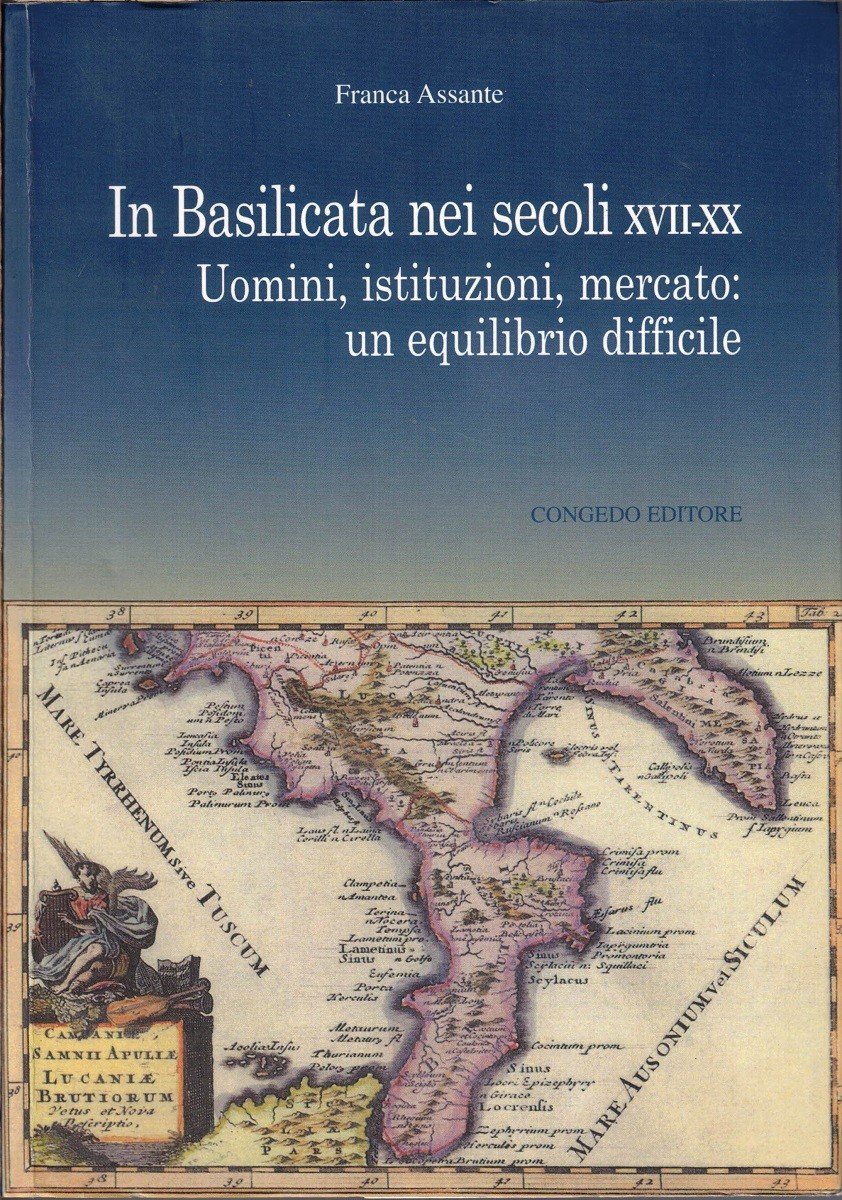 Franca Assante, In Basilicata nei secoli XVII-XX. Uomini, istituzioni, mercato: un equilibrio difficile, Congedo Editore, Galatina 2015, pp. 304, ill. b.n., cm 24, br. ed. con alette. Università del Salento. Pubblicazioni del Dipartimento di storia, società e studi sull’uomo, già Pubblicazioni del Dipartimento di Studi storici dal Medioevo all’Età contemporanea. Serie Studi storici, vol. 114. Collana saggi e ricerche, vol. 107. Indice: Prefazione – Prima parte. Basilicata e Calabria: due regioni in trasformazione (Proprietà, impresa e mano d’opera nell’agro calabro-lucano tra ‘700 e ‘800 – Rapporti di produzione e trasformazioni colturali in Basilicata e Calabria nel secolo XIX – Organizzazione e innovazione in agricoltura: il caso Basilicata e Calabria – L’agricoltura in Basilicata e Calabria dalle leggi speciali alla riforma agraria: i mutamenti strutturali) – Seconda parte. Basilicata: un’economia in sviluppo (La Basilicata tra due crisi: istituzioni, mercato e trasformazioni agrarie – Basilicata 1904. Il mito della colonizzazione interna – Basilicata 1930-1966. Dalla marginalità allo sviluppo: un percorso in salita) – Terza parte. Basilicata: storie di luoghi, di imprese, di uomini (Terra e uomini. Miseria e nobiltà. Viggiano nella crisi dell’età moderna – Un aspetto poco noto della Riforma agraria. La distruzione dell’Azienda Turati – Uniti dalla stessa fede per la rinascita della Basilicata. Il sodalizio Mazzarone, Scotellaro, Levi, Rossi-Doria). Minime tracce d’uso, per il resto ottimo esemplare.