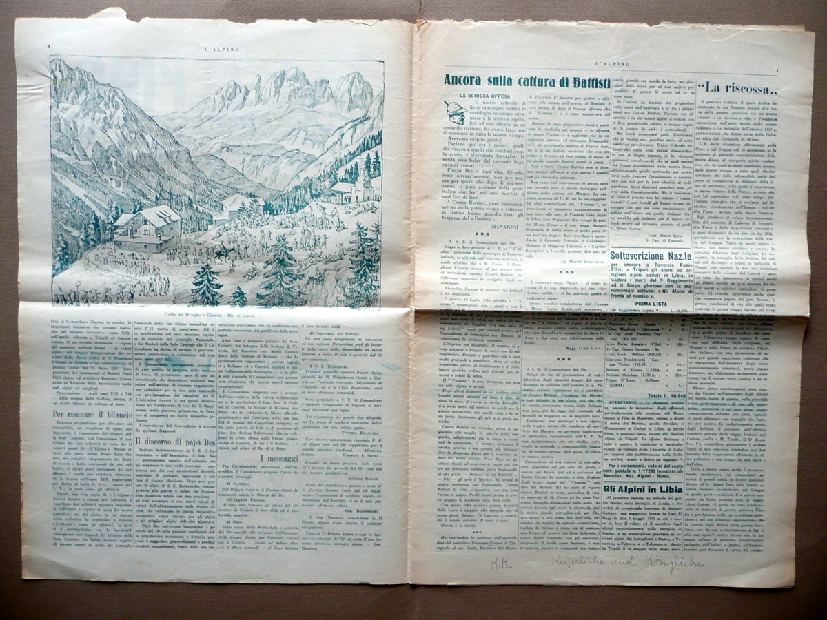 Quindicinale, L'assemblea dei gerarchi del 10° alla Città di Contrin" in "L'Alpino" Quindicinale del 10° Reggimento Alpini Fondatore I. Balbo Anno XVI - Numero 16 Roma, 15 Agosto 1934 Roma 1934, cm 41x28,5, pp. 8 con qualche ill. a colori nel t. (verde); numero completo. Margine sup. della prima pagina con applicata etichetta dattiloscritta per spedizione postale. Condizioni di conservazione Esemplare in buone condizioni con tracce d'uso, pieghe di conservazione, prima pagina con qualche piccola leggera brunitura; margini sup. con alcune irregolarità provocate dall'apertura maldestra di esemplare intonso (vedi foto); poche brevi annotazioni e sottolineature a matita. In apertura un articolo sull'assemblea dei gerarchi del 10° alla città di Contrin. Numero completo. SC03.D11504 N "