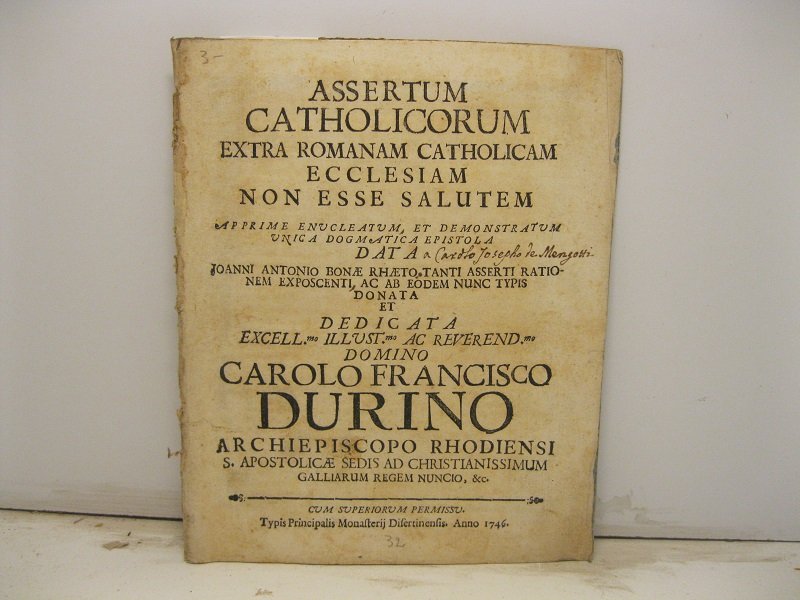 Assertum catholicorum extra Romanam catholicam ecclesiam non esse salutem apprime enucleatum et demonstratum unica dogmatica epistola data Ioanni Antonio Bonae Rhaeto tanti asserti rationem exposcenti ac ab eodem nunc typis donata et dedicata Excell.mo Illust.mo ac Reverend.mo domino carolo Francisco Durino