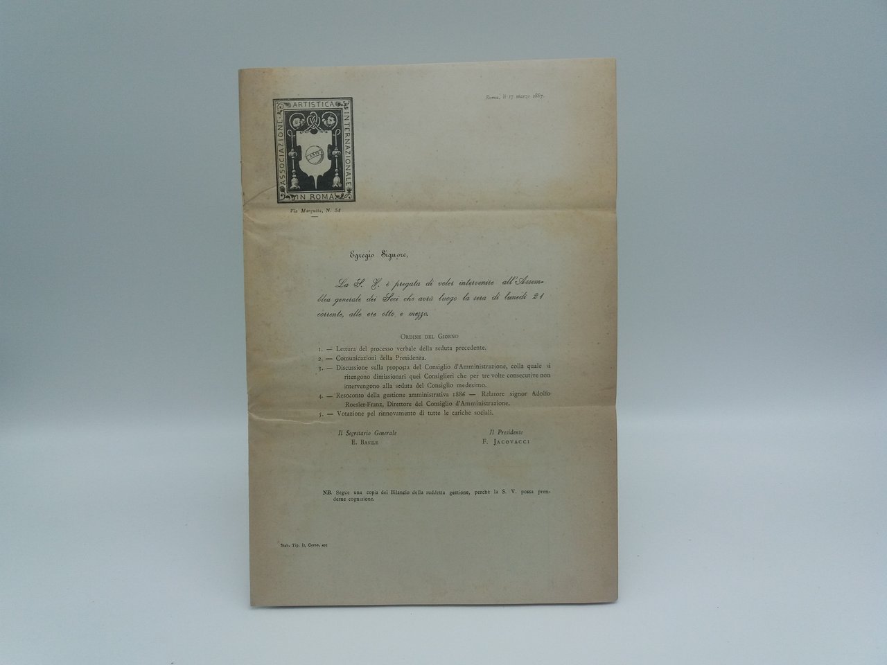 Circolare a stampa cm 21 x 30,5, pp. (12). Stemma al primo foglio. Pieghe per invio postale relativo francobollo. Invito per l'assemblea generale di questa importante e nota istituzione romana che, proprio nel 1887 si insedio' nella storica sede di Palazzo Patrizi, gia luogo di residenza per pittori italiani e stranieri. Gran parte del mondo artistico romano, da quel momento in avanti, passo' per le sale di questo sodalizio che qui ebbe sede fino al 1960. La circolare contiene, oltre all'invito, il bilancio economico per 1886, da cui e' possibile trarre interessanti notizie sulle vicende associative, l'elenco dei soci (425) e le cariche sociali. Tra i nomi presenti: C. Biseo, Pio Joris, Pistrucci, Sacconi, Mola, Cabianca ecc.