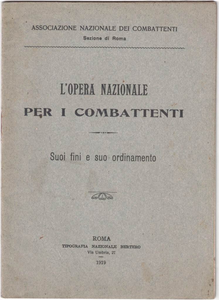 Associazione Nazionale dei Combattenti – Roma, L’Opera Nazionale per i Combattenti. Suoi fini e suo ordinamento, Tipografia Nazionale Bertero, Roma 1919, pp. 16, cm 18, rilegatura a punto metallico. L’Associazione Nazionale dei Combattenti e Reduci fu fondata nel 1919 all’indomani della fine del primo conflitto mondiale. In breve tempo sul territorio nazionale fiorirono numerose sezioni locali dell’Associazione, tutte con gran seguito di adesioni. Il presente opuscolo fu edito dalla Sezione di Roma dell’Associazione. Minime tracce d’uso, lievi segni del tempo, per il resto ben conservato.