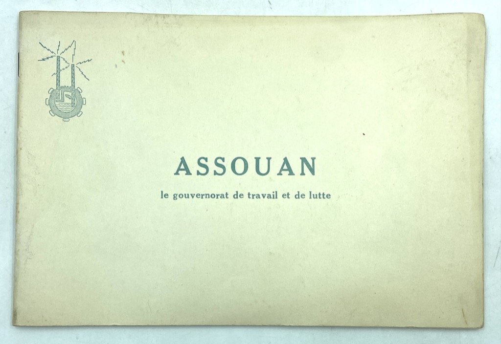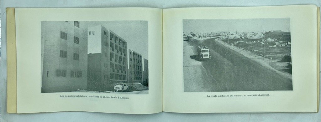Brossura editoriale spillata, formato album cm 16.5 x 24, pp 32 con alcune fotografie in nero. Testo in francese. Pubblicazione edita dal Governatorato di Assuan (Aswan) della Repubblica Araba Unita, con resoconto degli sviluppi economici e sociali e dei progetti pubblici nel periodo fino al 1964, in particolare riguardo la Diga di Assuan, la distribuzione delle terre, l’estrazione mineraria, l’edilizia pubblica e i trasporti, l’impiego, la riforma agraria. Con 16 fotografie: scuola primaria nel villaggio di Aboul Riche, unità sanitaria a El Chatb a Kom Ombo, unità agricole, case popolari, strade asflatate ad Assouan, cooperativa agricola, lavori sulla diga, Maison de la Culture, edifici turistici, Club Nautico, stadio ad Assuan.