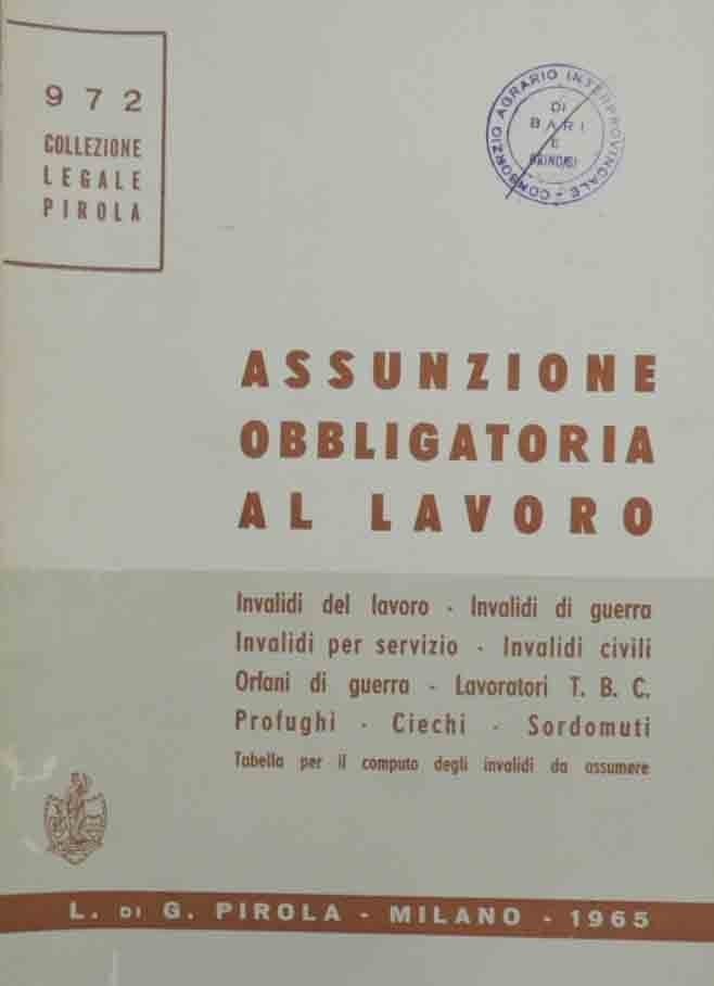 Assunzione obbligatoria al lavoro. Invalidi a lavoro, invalidi di guerra, invalidi per servizio, invalidi civili, orfani di guerra, lavoratori T.B.C., profughi, ciechi, sordomuti. Tabella per il computo degli invalidi da assumere, L. di G. Pirola, Milano 1965, pp. 88, cm 22, br. ed. Collana Collezione legale Pirola, n. 972. Timbro di biblioteca estinta alla prima di copertina. Tracce d’uso, minime abrasioni alla brossura, sgualciture, uniforme ingiallitura della carta, ma nel complesso buona copia.