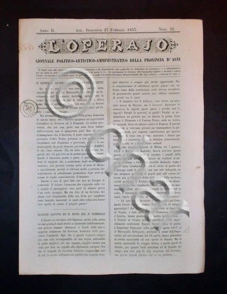 Asti - Giornale L'Operajo (operaio) - N° 22 - Anno II - 27 Febbraio 1853