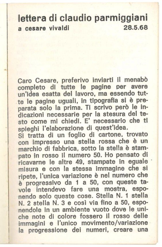 Mm. 109x68. Pp. [70], di cui una in decalcomania, stampate in nero e rosso. Comprende una lettera di Parmiggiani a Cesare Vivaldi e risposta. Brossura editoriale con titolo alla copertina anteriore. Lieve alone al margine superiore sinistro del piatto posteriore. Edizione originale a cura di Vincenzo Agnetti e Corrado Costa, stampata in tiratura limitata di mille copie. Copia molto ben conservata.