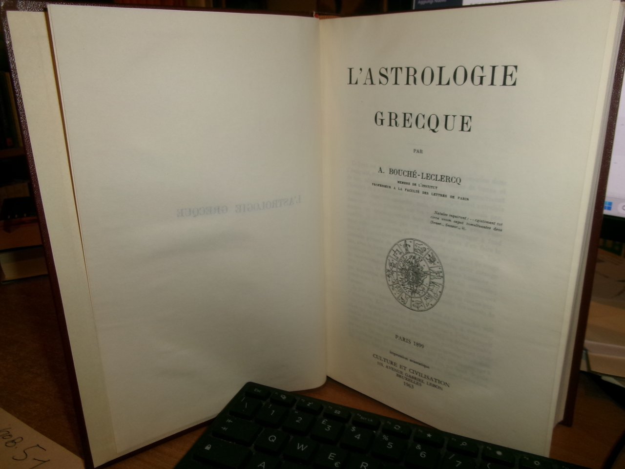 (Astrologia) A. Bouché-Leclercq. Bruxelles, Culture et Civilisation, 1963. L' ASTROLOGIE GRECQUE. Edizione identica a quella di Parigi del 1899. In-8°, pelle bordeaux con titolo in oro al dorso. xx, 658 pp. con alcune figure n.t. Bellissimo esemplare. Non vendibile all' Estero. Neg. esot. mob. 51